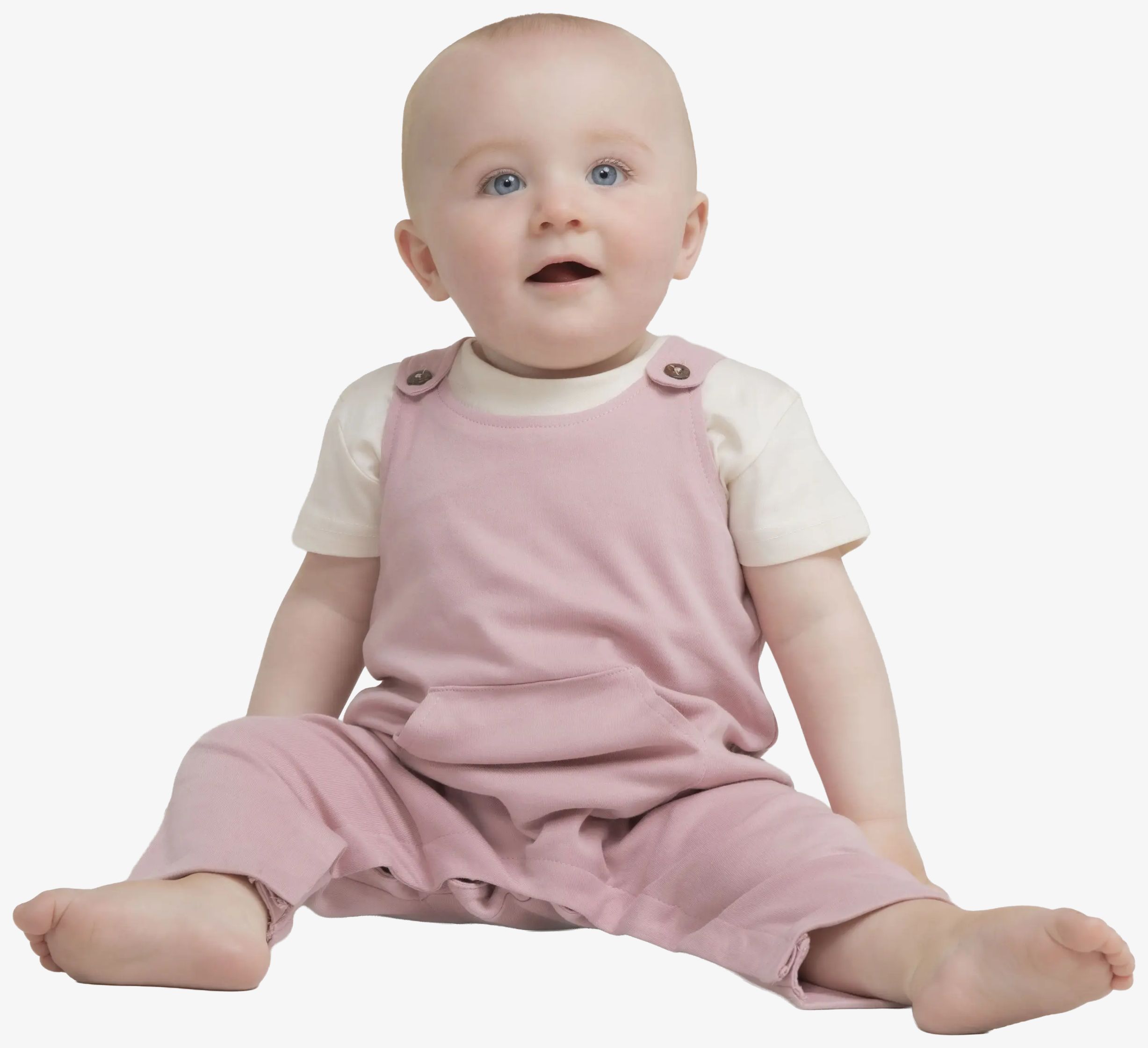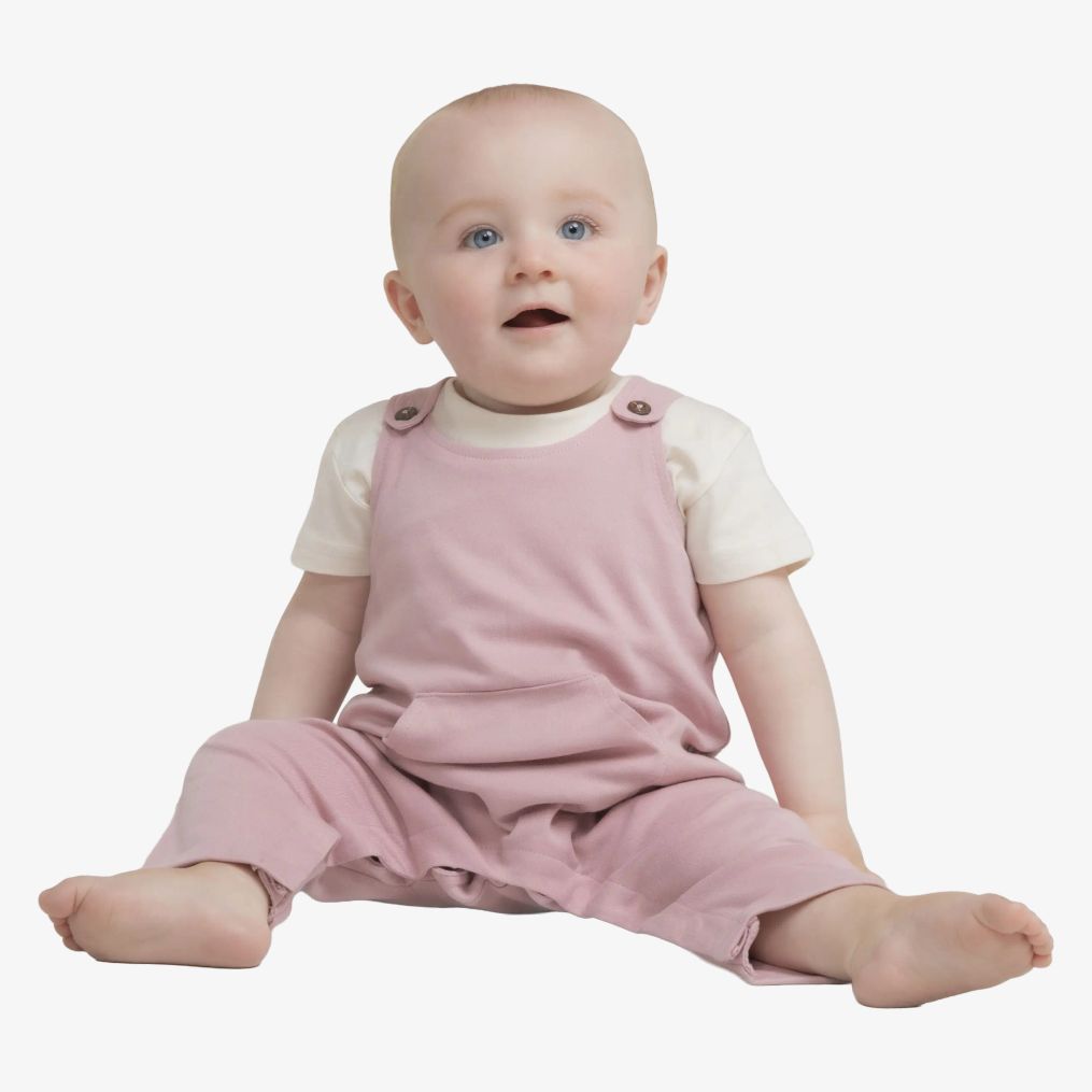 Die Organic Cotton Dungaree ist eine Baby-Latzhose mit Knopfverschluss an den Schultern, Kängurutasche, umgeschlagenem Beinabschluss und Druckknöpfen am Beinabschluss für leichteres Anziehen.