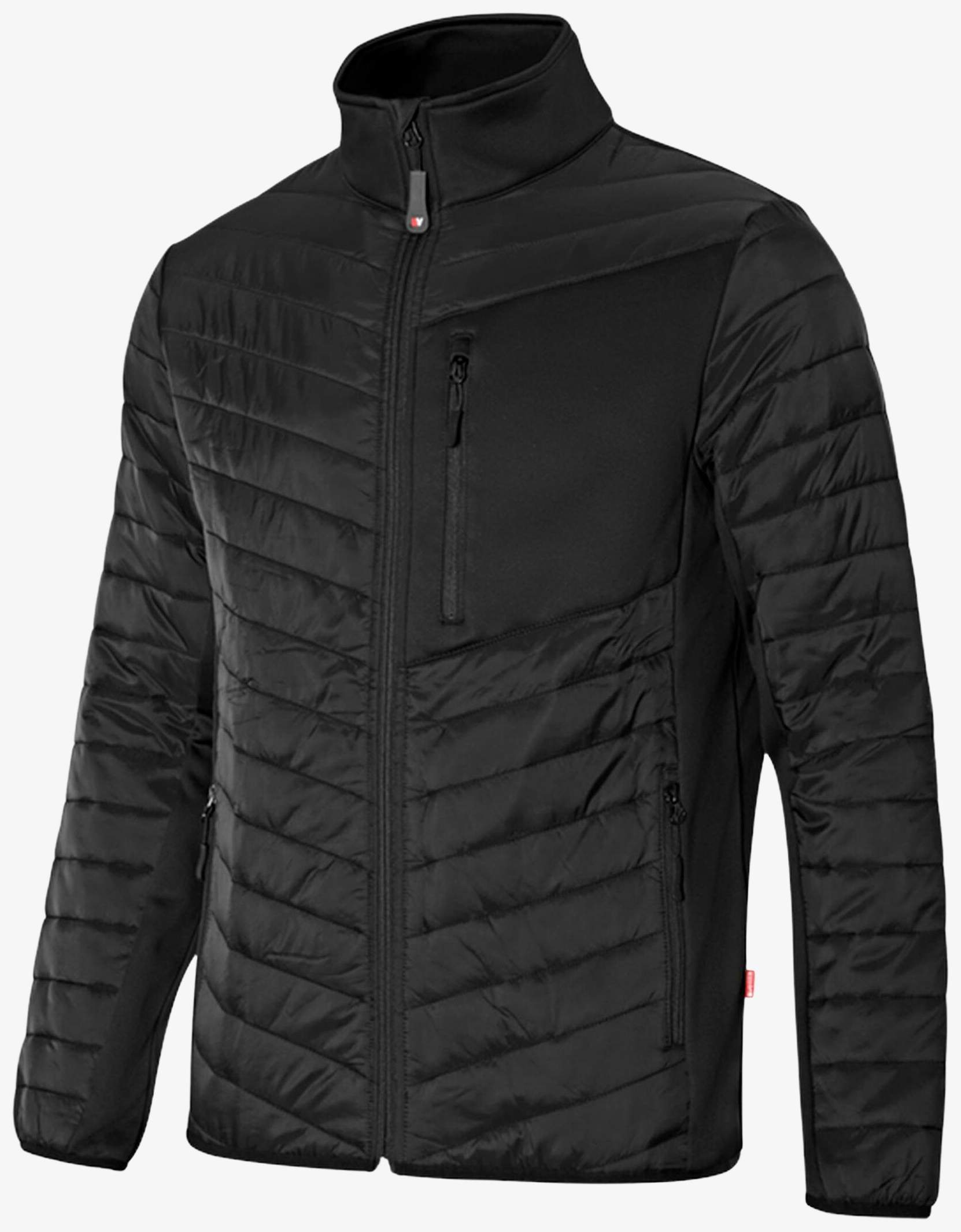 Die leichte gesteppte Jacke hat einen großen umgekehrten Reißverschluss mit einer inneren Abdeckung im oberen Bereich. Sie enthält einen Softshell-Einsatz auf der Brust sowie kontrastierende Verstärkungen am Kragen und unter den Ärmeln. Elastische Einfassungen sind an Bündchen und Taille für eine Anpassung vorhanden.