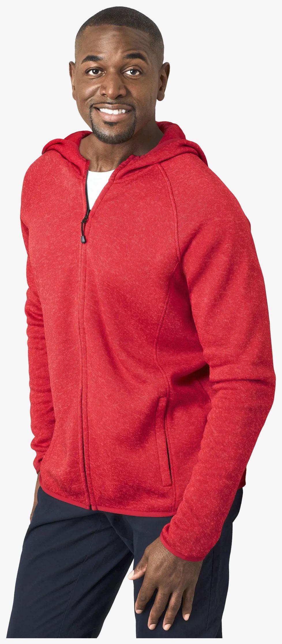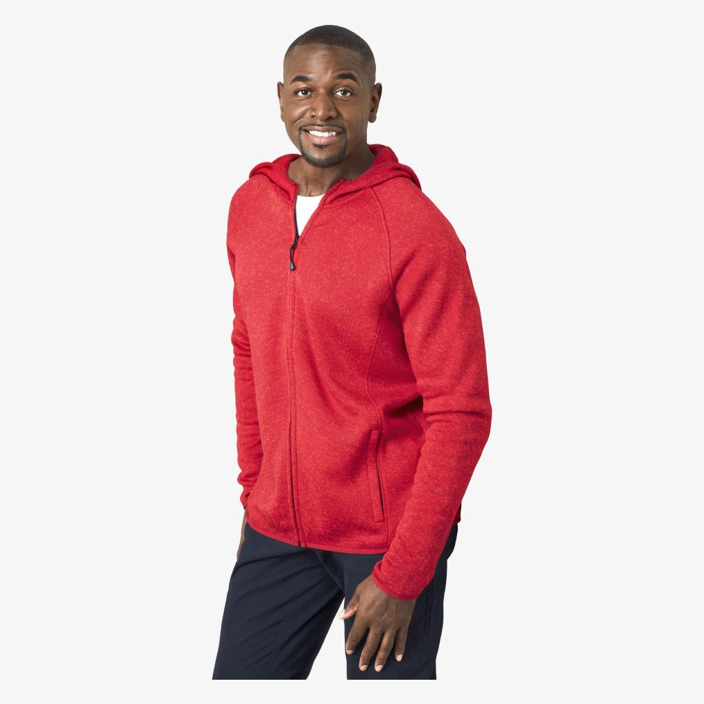 Die warme, elastische Fleece-Strickjacke mit Kapuze verfügt über eine dreiteilige Kapuze mit elastischen Kanten und verdeckten SBS-Reißverschlüssen. Sie enthält zwei seitliche Reißverschlusstaschen und Raglanärmel. Das Material besteht aus Polyester mit Strickstruktur.
