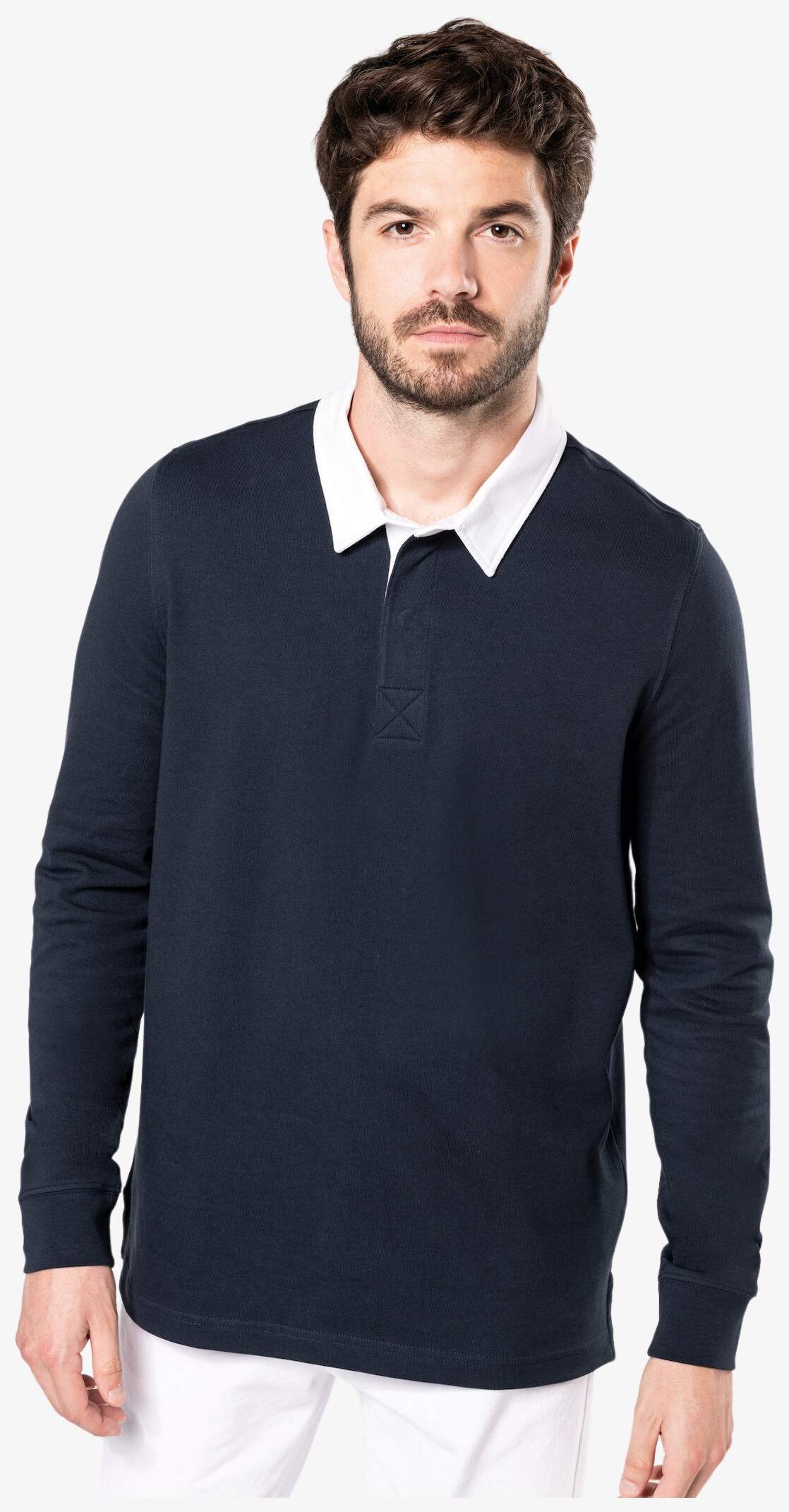 Das polo rugby aus gekämmtem, vorgewaschenem Jersey-Baumwollstoff verfügt über einen kontrastierenden weißen Twill-Baumwollkragen (außer Farbe Red Dark Grey mit schwarzem Kragen), eine 3-Knopf-Leiste, 1x1 Rippbündchen und ein innen liegendes Schrägband am Kragen mit seitlichen Schlitzen.