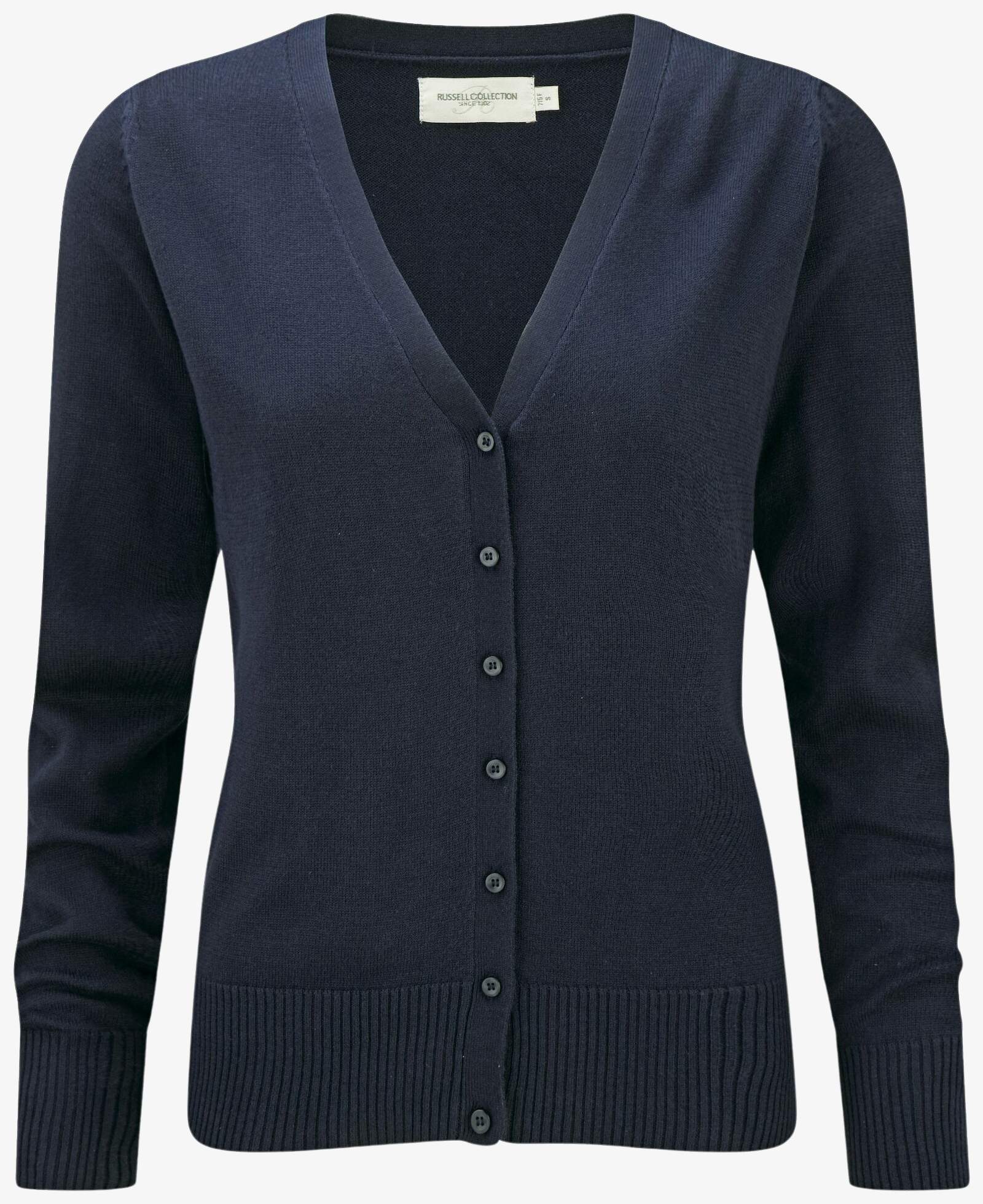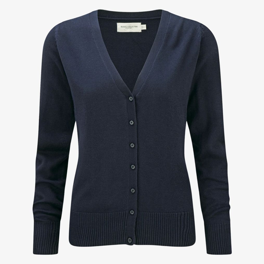 Der Ladies\' V-Neck Knitted Cardigan ist eine V-Ausschnitt-Strickjacke aus feinem Strick, mit Ton-in-Ton-Knöpfen und eingesetzten Ärmeln. Zusammensetzung: 50% Baumwolle, 50% Acryl. Rippbündchen an Ärmeln und Saum mit Elasthan für Formstabilität.