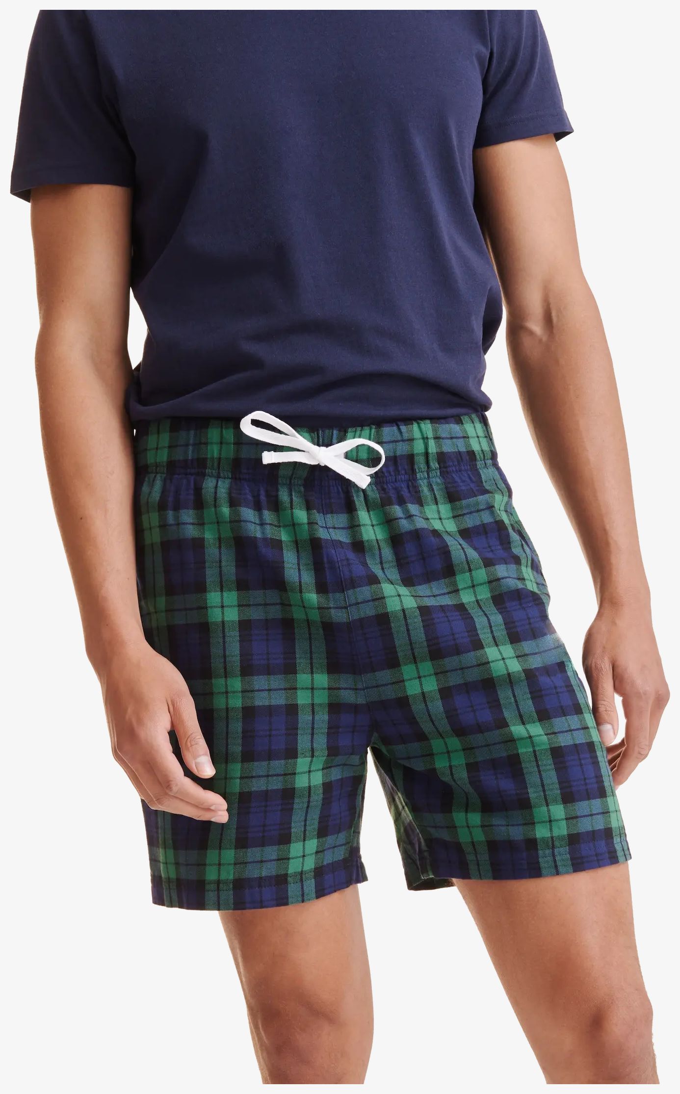 Die kurze Herren-Pyjama-Hose verfügt über einen elastischen Bund mit kontrastierendem Kordelzug, eine aufgesetzte Gesäßtasche, flache Säume und ein abnehmbares Etikett.
