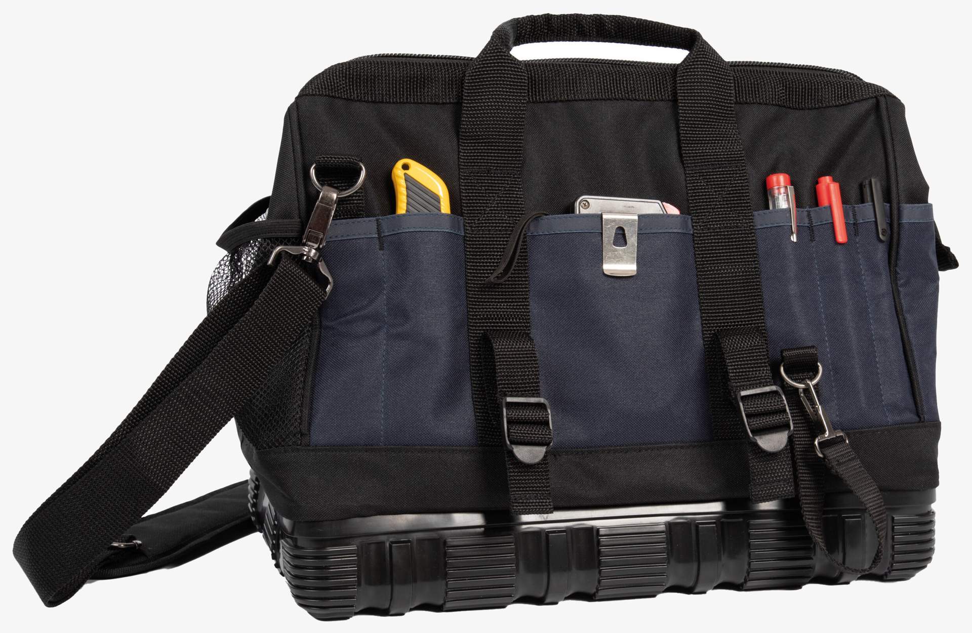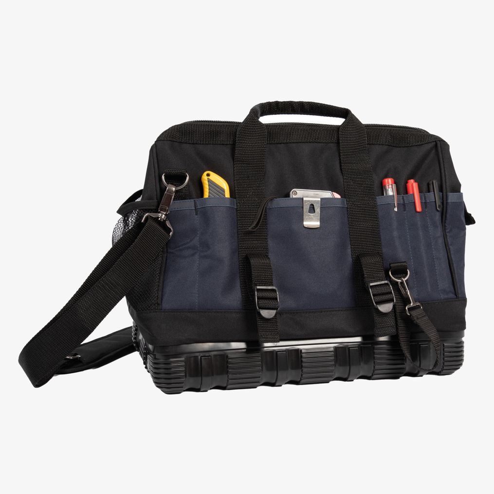 Die Werkzeugtasche mit Kunststoffboden ist aus Polyester gefertigt mit einer großen einzelnen Öffnung oben für einfachen Zugang zu den Werkzeugen. Die seitlichen Gurte verstärken die Struktur auch unter mäßiger Last und ermöglichen die Aufnahme einer Wasserwaage. Der Schultergurt ist verstellbar für angepassten Transport.