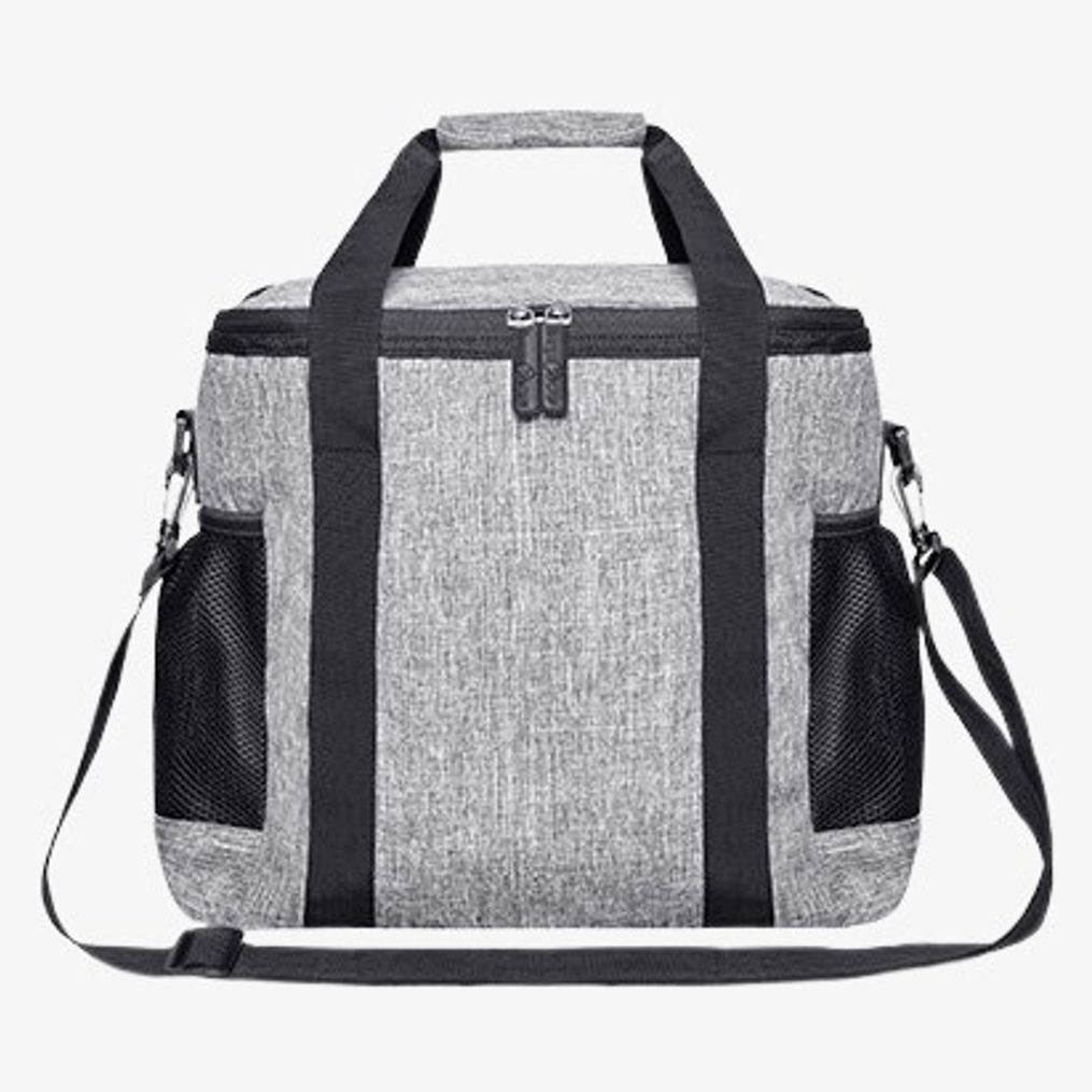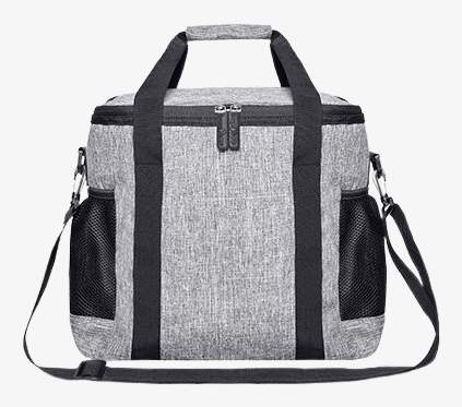 Die isolierte Tasche aus grauem meliertem 600D Polyester verfügt über ein Hauptfach mit Reißverschluss. Sie hat zwei seitliche Netztaschen aus Airmesh mit elastischem Kordelzug, einen abnehmbaren verstellbaren Tragegurt und zwei Schlaufen mit gepolstertem Klettgriff. Die Isolierung besteht aus Schaumstoff. Alle Verschlüsse sind mit einem rutschfesten Gummizipper versehen.