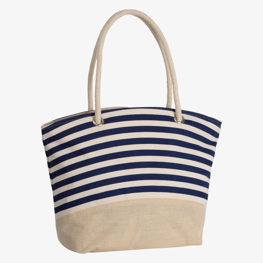 Die Einkaufstasche im Matrosenstil aus Jutestoff besteht aus Canvas-Baumwolle mit Streifenmuster. Sie verfügt über eine Innentasche und Baumwollgriffe mit einer innenliegenden Kordel in Naturfarbe. Die Maße betragen 47x14x35 cm.