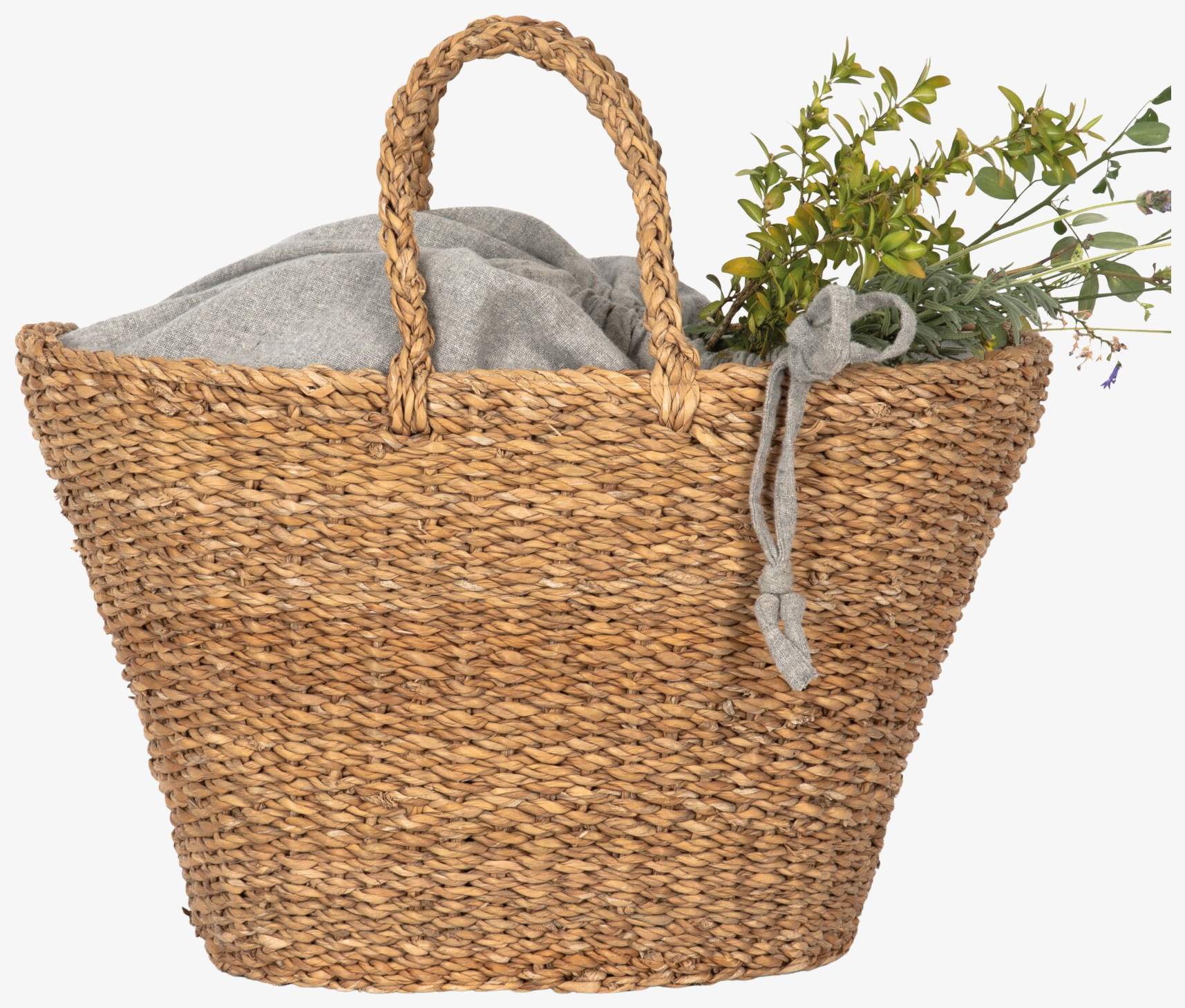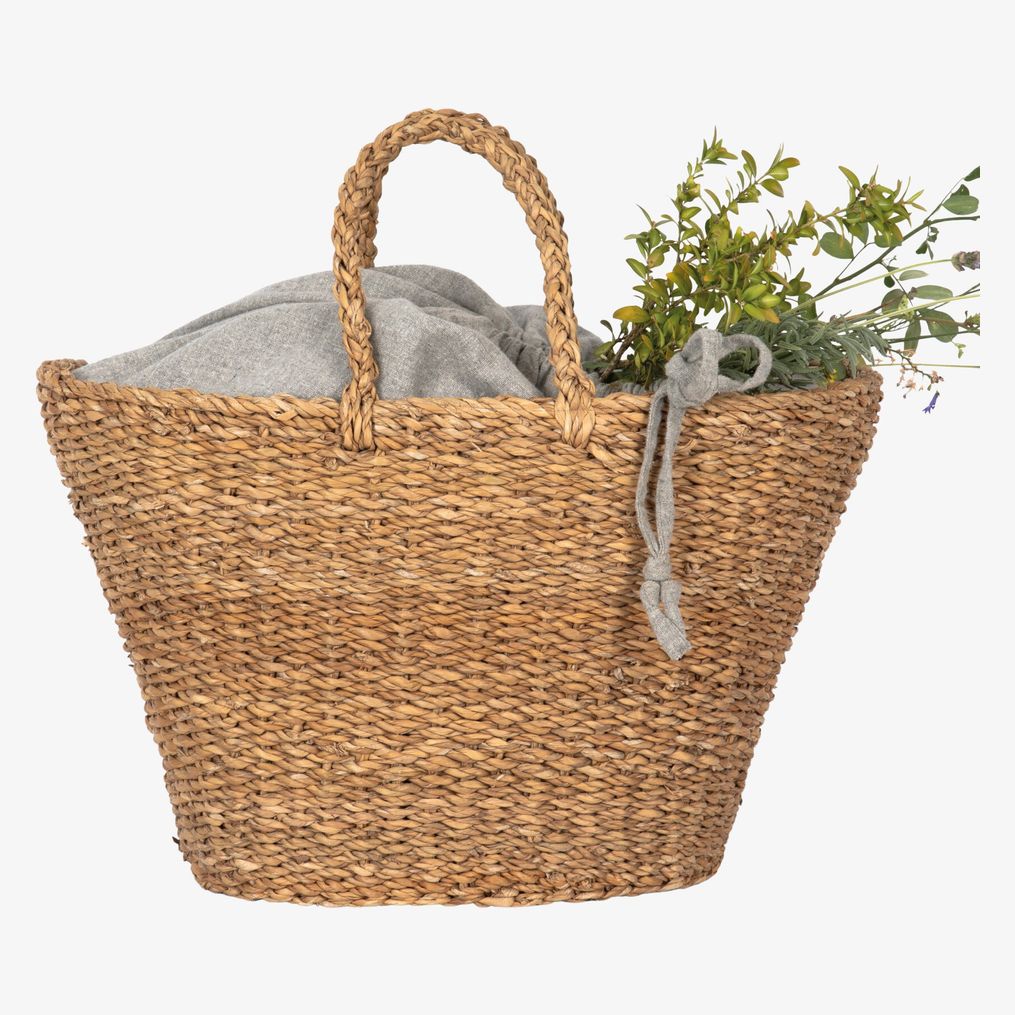 Der handgeflochtene Korb besteht aus pflanzlicher Algenfaser mit einem handgewebten Innenfutter aus recycelten Materialien (80% Baumwolle, 20% Polyester). Das traditionelle "Tant"-Gewebe verleiht dem Stoff ein besonderes handwerkliches Aussehen. Das Fassungsvermögen beträgt 26 Liter.