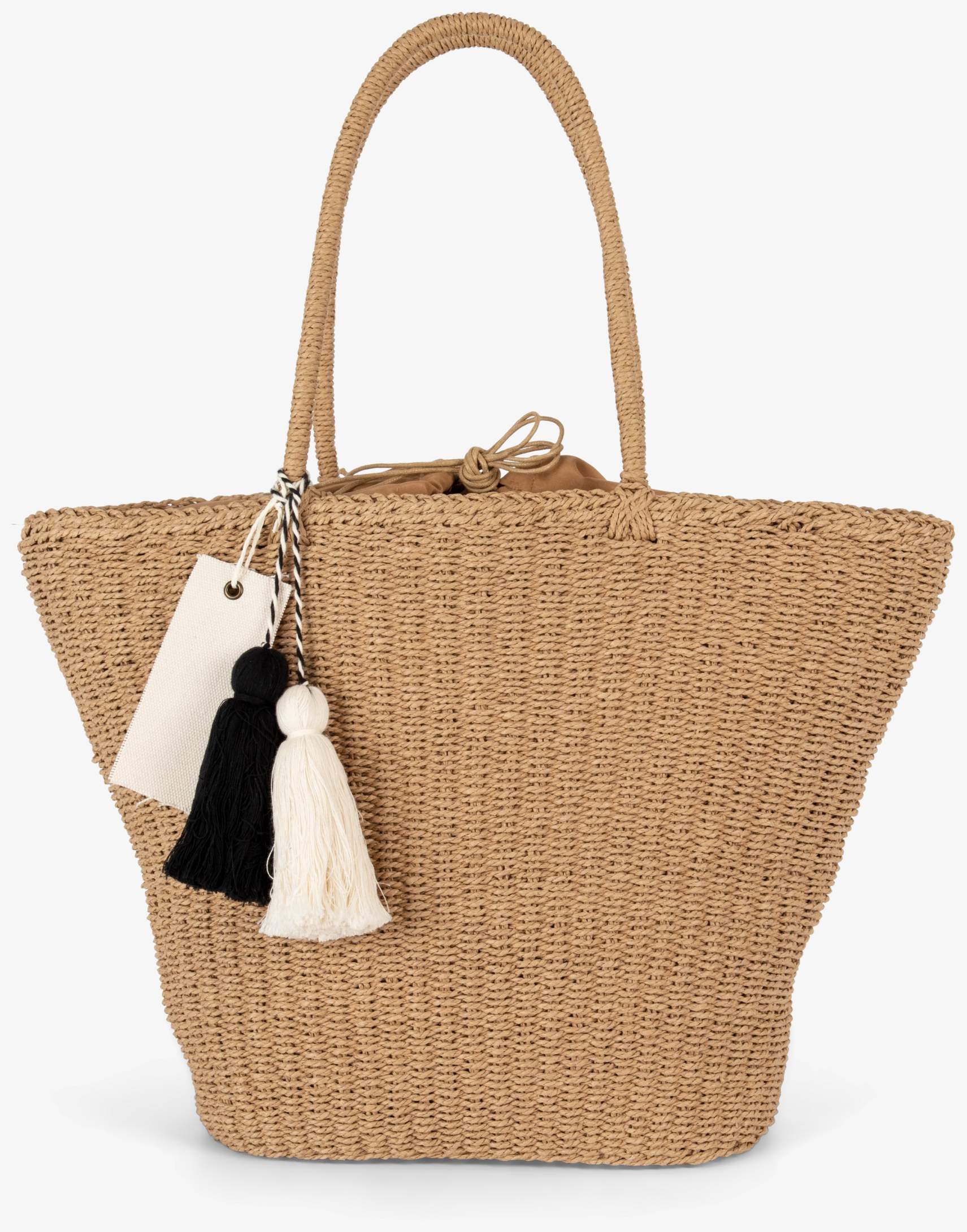 Der panier shopping besteht aus einer Außenhülle aus Papierfaser und einem Innenfutter aus recyceltem Polyester mit einer kleinen integrierten Tasche. Er ist mit geflochtenen Seilgriffen ausgestattet und mit einer zweifarbigen Baumwollquaste sowie einem großen Baumwolletikett 12x5 cm verziert.