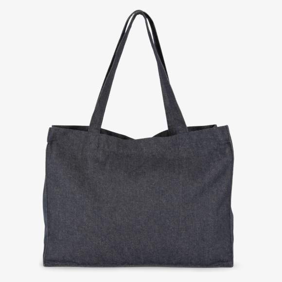Die große Denim-Shoppingtasche besteht aus recyceltem Material, enthält 70% recycelte Baumwolle, 28% recyceltes Polyester und 2% andere Fasern. Die Tragegriffe sind aus dem gleichen Material wie der Taschenkörper gefertigt und sorgen für eine einheitliche Textur und Farbe.