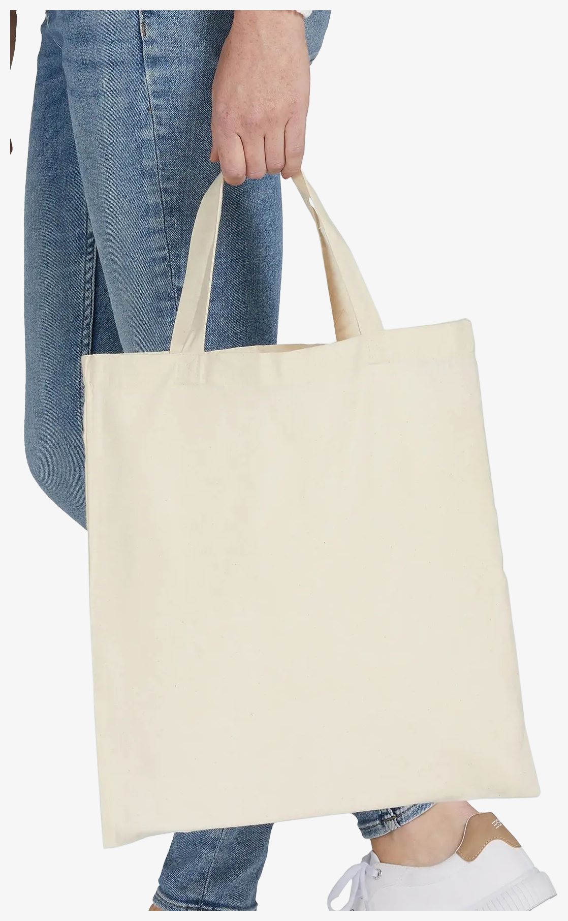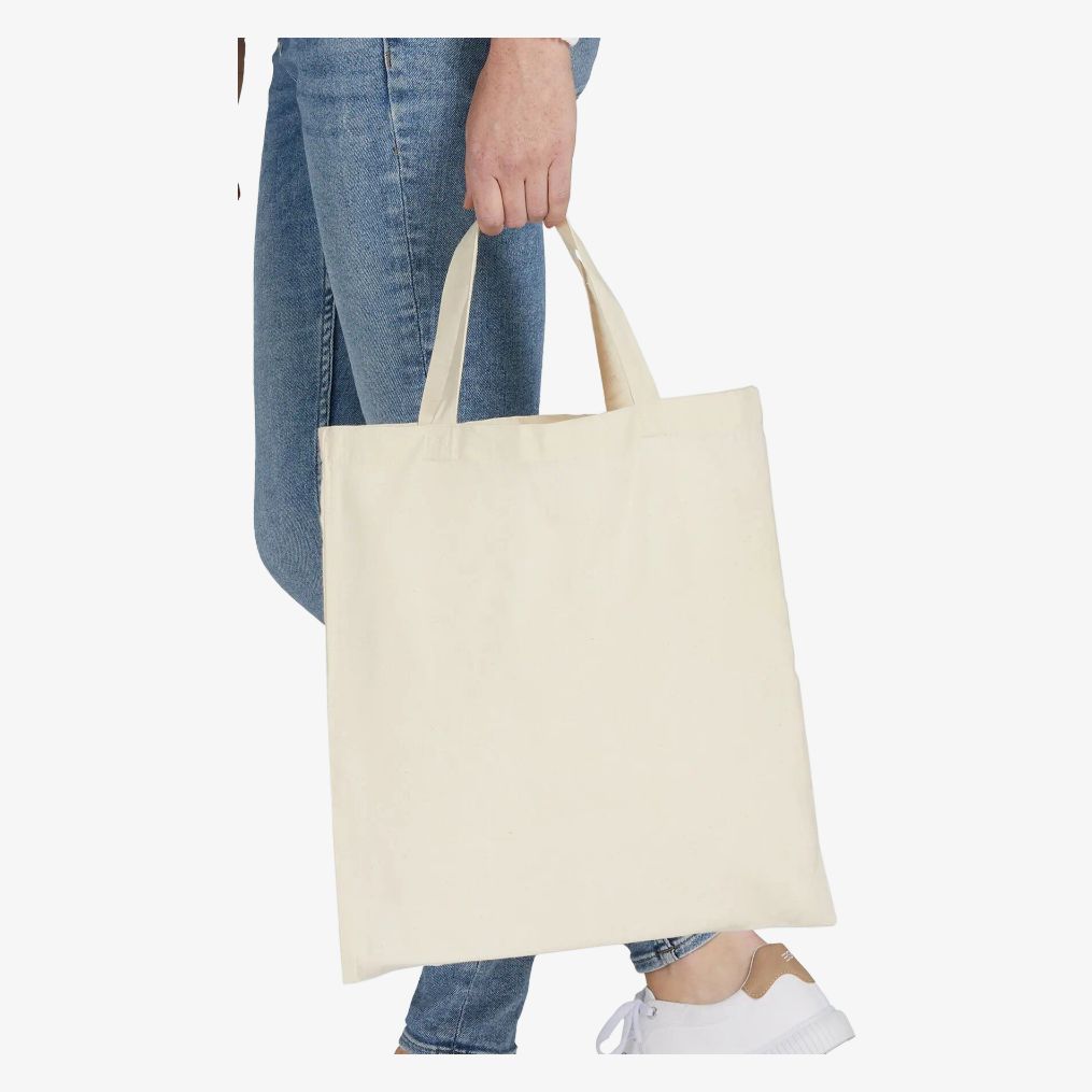 Die Einkaufstasche aus Bio-Baumwolle verfügt über kurze Griffe und verstärkte Nähte für besseren Halt. Dieses Modell enthält Kreuzstiche an den Griffen und umgeschlagene Nähte für eine saubere Verarbeitung. Die Griffe messen 35 cm. Die Maße betragen 38 x 42 cm.