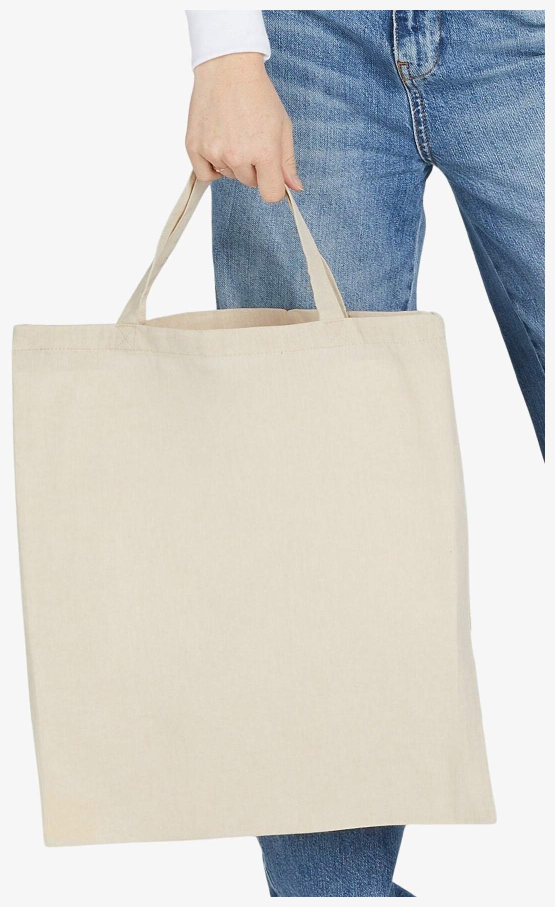 Die recycelte Einkaufstasche besteht aus recycelten Materialien, die Baumwolle und Polyester verbinden. Sie hat kurze Griffe von etwa 35 cm und eine durch Innennähte mit Overlockstich verstärkte Struktur.