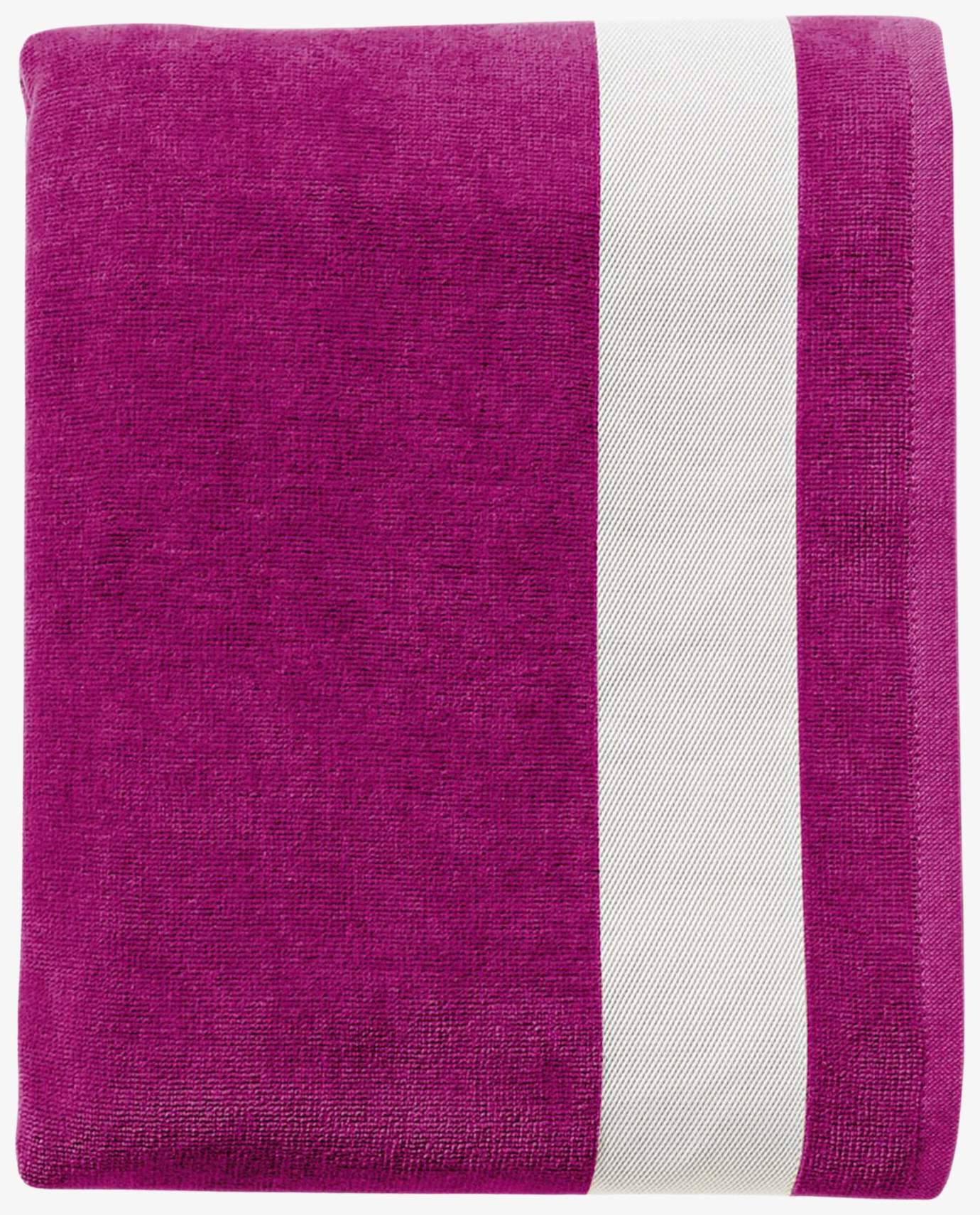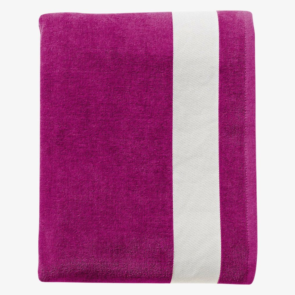 Das Handtuch Lagoon eignet sich für den Strandgebrauch mit einer Oberfläche aus zweifarbigem Baumwollvelours und einem weißen Uni-Streifen an beiden Enden.