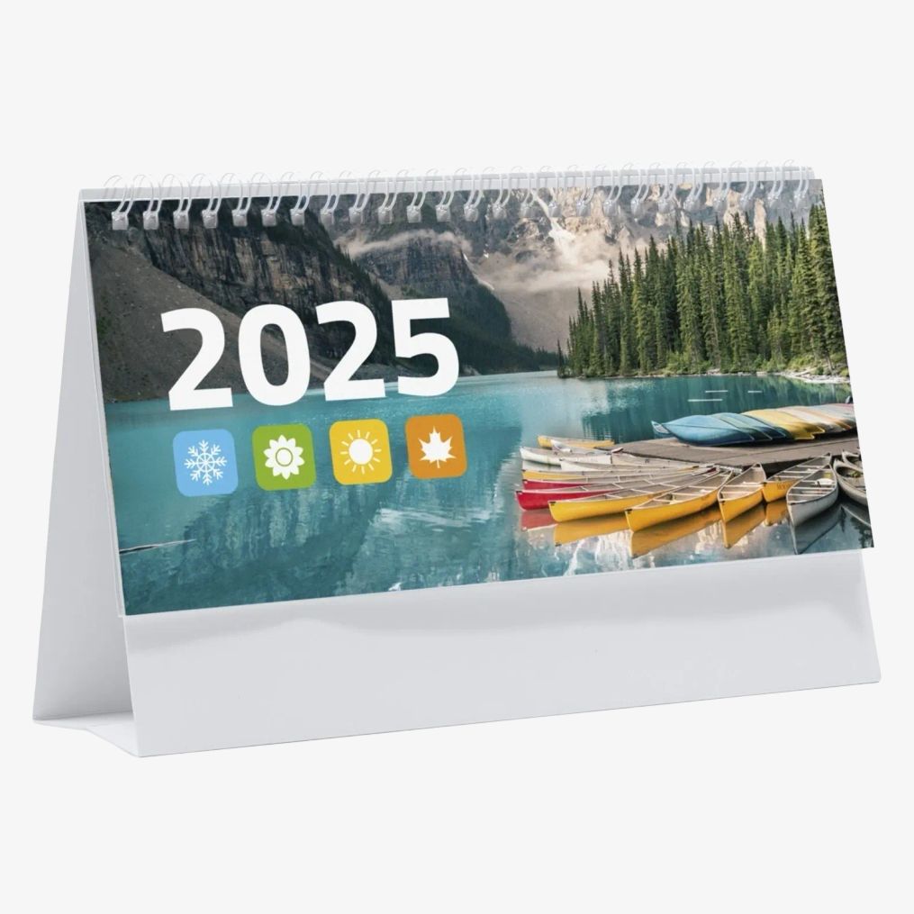 Der horizontale Bürokalender enthält ein Design mit dem aktuellen Monat, dem vorherigen Monat und dem folgenden Monat sowie einen Jahreskalender. Er beinhaltet ebenfalls die Heiligen. Verfügbare Sprachen sind Spanisch und Englisch.