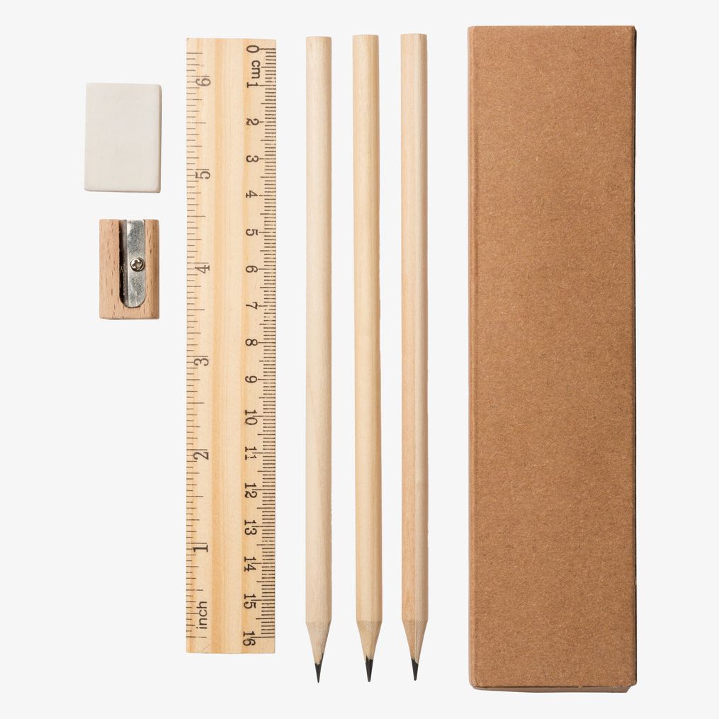Das Schreibset aus natürlichem Holz wird in einer Kraftpapierbox präsentiert. Es enthält ein Lineal, drei Bleistifte, einen Radiergummi und einen Anspitzer.