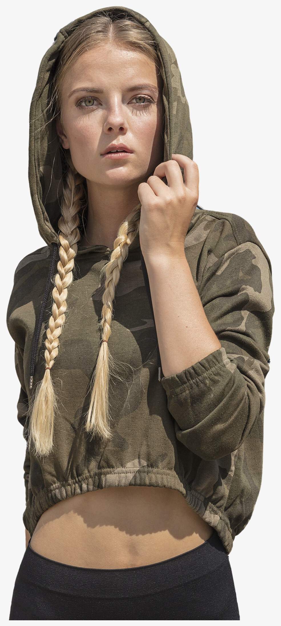 Die Damen Kapuzenjacke Ladies Camo Cropped Hoody hat eine kurze Passform mit eingesetzten Ärmeln und einem gekreuzten Kragen. Die Kapuze ist mit einem Kordelzug mit Ösen und Metallenden ausgestattet. Der Rücken ist länger als der Vorderteil und der Saum ist offen mit elastischen Bündchen.