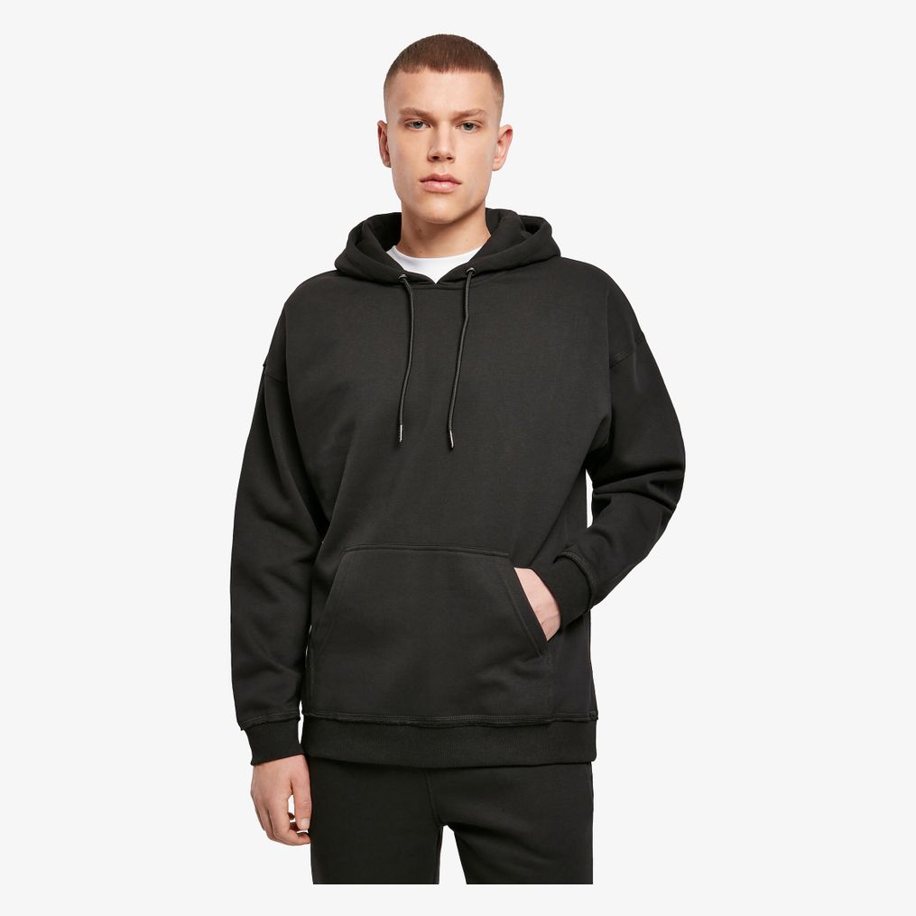 Das Kapuzensweatshirt hat einen Oversize-Schnitt mit erweiterten Schultern und einem überlappenden Kragen. Die Kapuze ist mit einer Kordel mit Metallenden und Metallösen ausgestattet. Gerippte Bündchen und Saum mit offenen Kanten vervollständigen das Design. Das Größenetikett ist markenlos.
