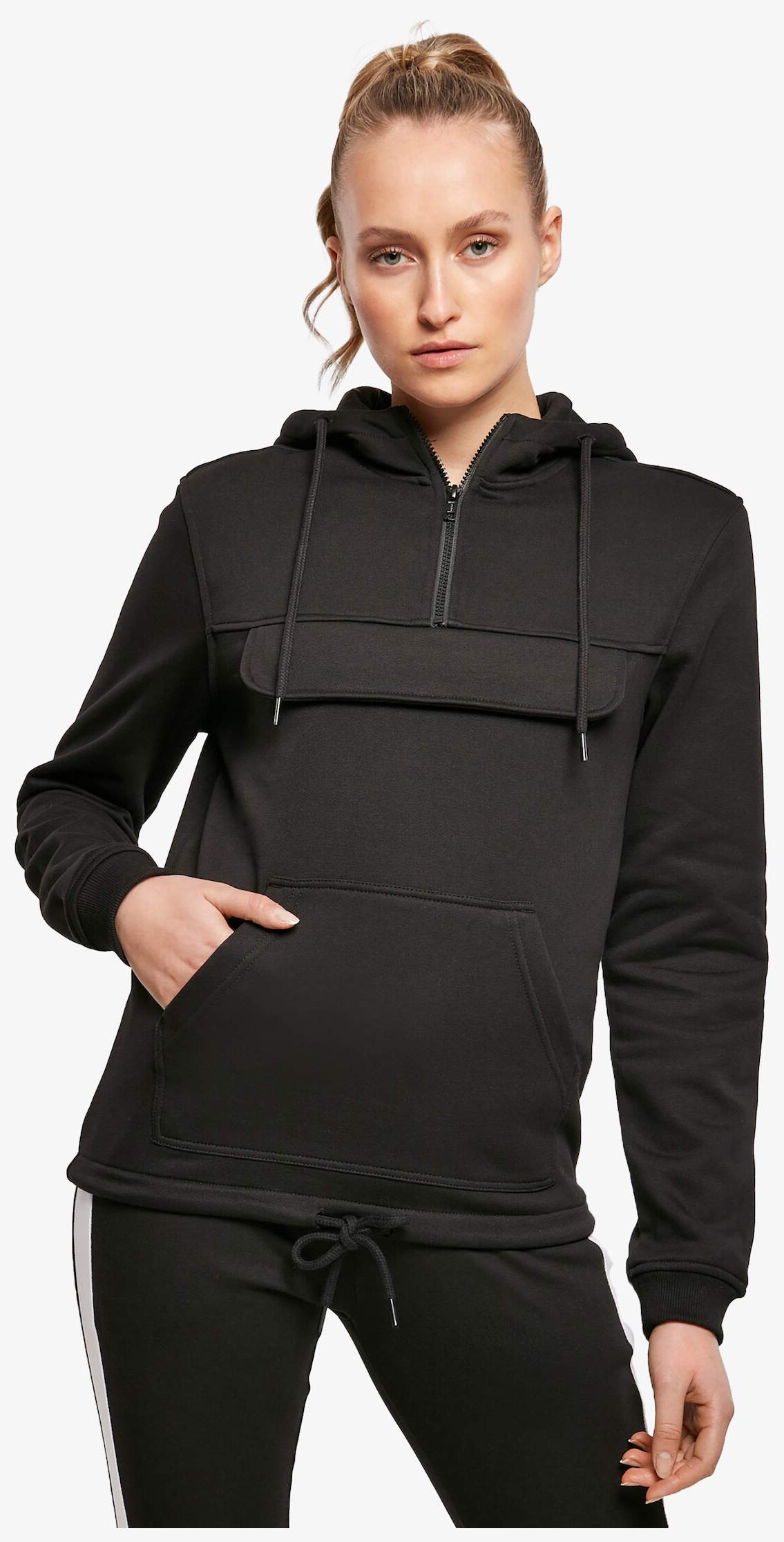 Der Ladies Sweat Pull Over Hoody ist ein Kapuzenpullover mit langen Ärmeln, ausgestattet mit einer Kapuze mit Stehkragen und Verschluss. Er verfügt über eine aufgesetzte Brusttasche und ein dünnes Taillenband. Dieses Modell verbindet Weichheit und Komfort durch seine Mischung aus Baumwolle und Polyester.