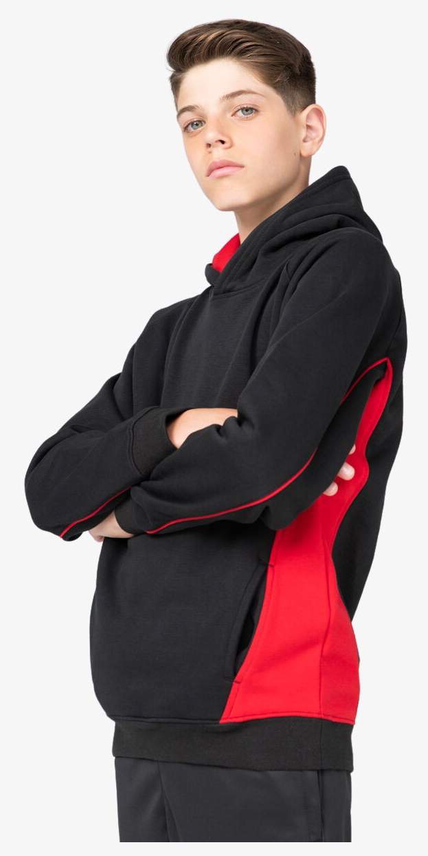 Der Kids pullover hoodie ist ein Kapuzenpullover mit Kordelzugkapuze, gefüttert in Kontrastfarbe, und schrägen Fronttaschen. Er hat kontrastierende Seiteneinsätze und eine kontrastierende Paspel an den Raglanärmeln.