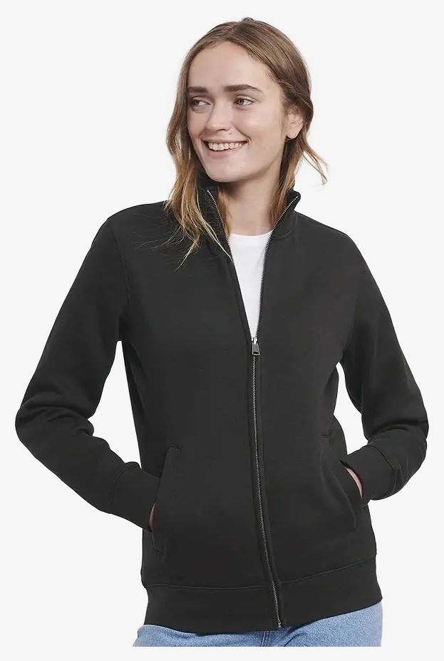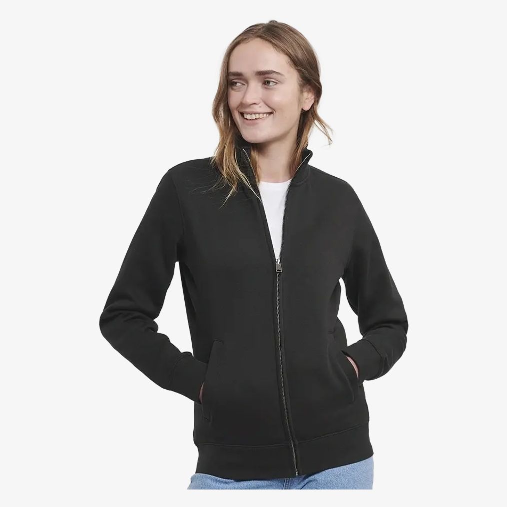 Die Damenjacke mit Reißverschluss hat einen taillierten Schnitt mit Reißverschluss und Leistentaschen. Der Stehkragen ergänzt dieses Modell mit 100 % Baumwolle außenstoff.