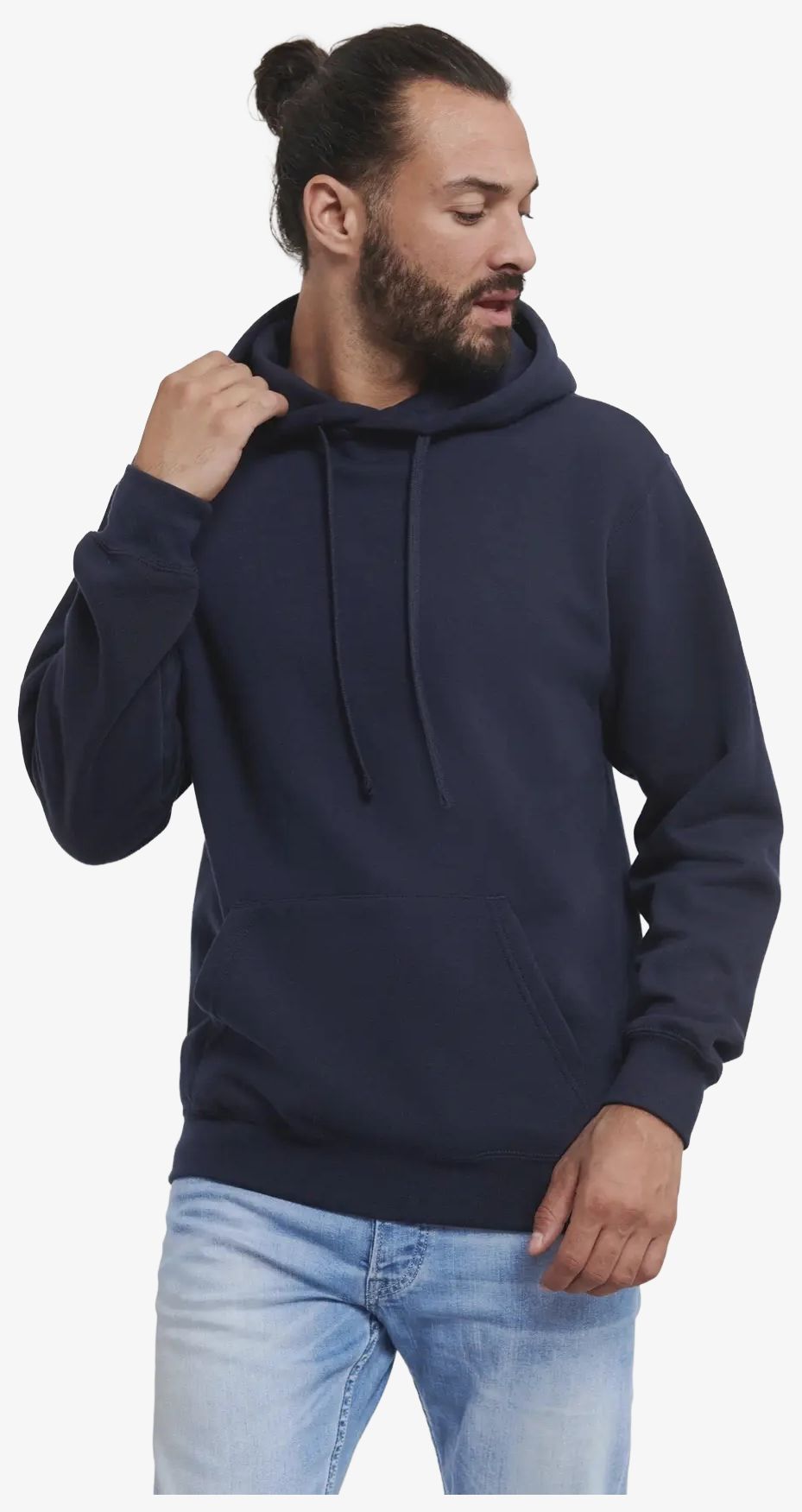 Das Kapuzensweatshirt 575 verfügt über eine Fronttasche, enge Ärmel und eine gefütterte Kapuze mit flachem Kordelzug. Der Nackenbesatz ist aus Fischgrätenstrick