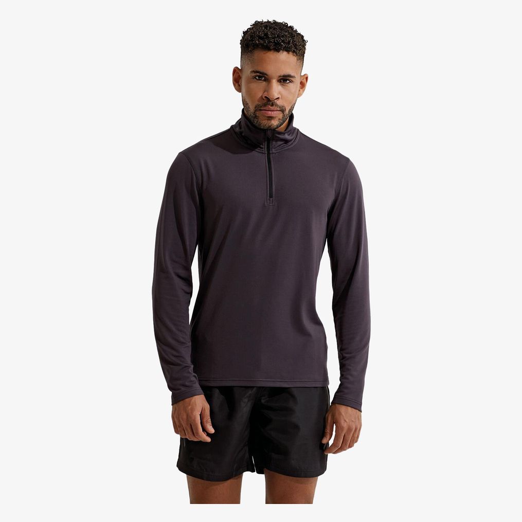 Das 1/4 Reißverschluss-Oberteil aus recyceltem angerautem Stoff besteht aus recyceltem Polyester mit Elasthan. Es hat ein gebürstetes Innenfutter und ein atmungsaktives Material, das Schweiß ableitet. Dieses Modell hat lange Ärmel und eine Mesh-Gewebestruktur.