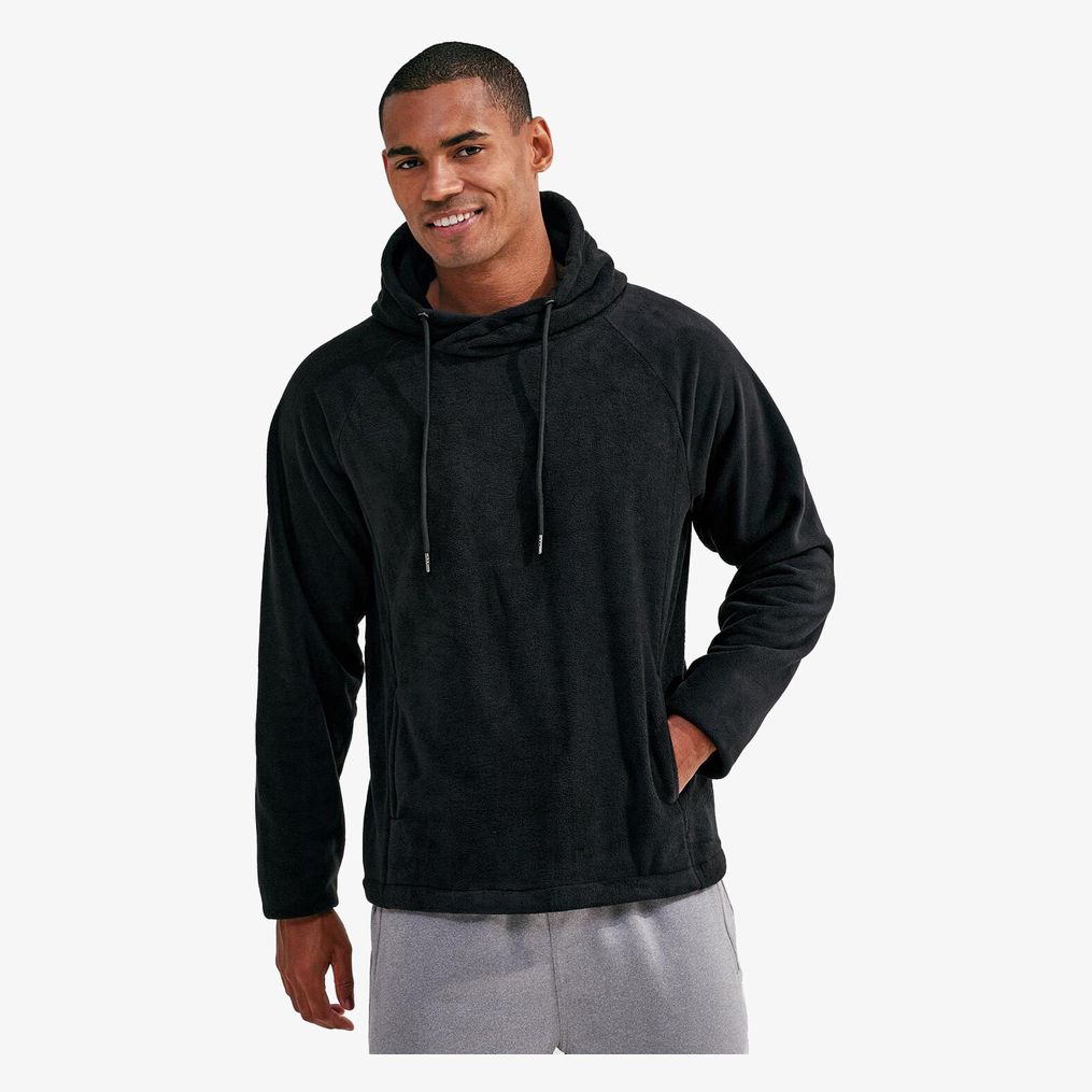 Das Mikrofleece-Kapuzensweatshirt besteht aus 100% Polyester-Mikrofaser. Der lockere Schnitt hat einen Kragen mit überkreuzten Details und einen einfarbigen Kordelzug. Das Vorderteil verfügt über verdeckte Taschen und einen elastischen Kordelzug mit Kunststoffversteller am inneren Saum. Das innere Nähetikett enthält die notwendigen Informationen.