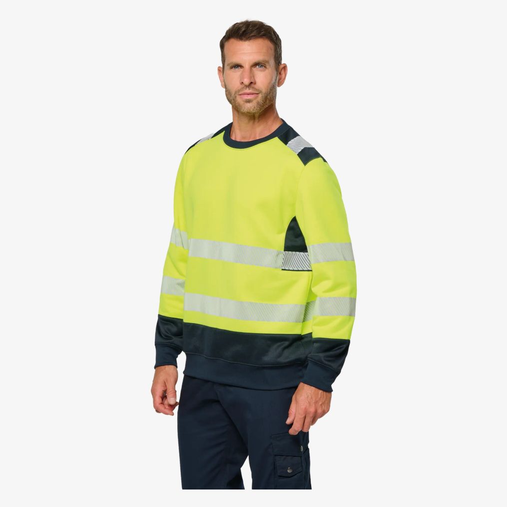 Das sweat-shirt sécurité recyclé col rond unisexe ist aus angerautem Fleece mit Anti-Pilling-Behandlung gefertigt. Es hat einen geraden Schnitt mit kontrastierenden Schultereinsätzen und 5 cm breite, segmentierte retroreflektierende Streifen an Vorderseite, Rückseite und Ärmeln. Der doppellagige Kragen besteht aus 1x1 Rippenstrick aus 100% recyceltem Polyester. Das Kleidungsstück verfügt außerdem über kontrastierende Einsätze unter den Armen, 1x1 Rippenbündchen an Ärmeln und Saum aus 100% recyceltem Polyester sowie ein abnehmbares Etikett.