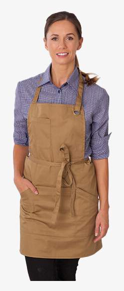 Die Schürze im Denim-Stil mit Latz misst 91 x 71 cm. Sie besteht aus Polyester und Baumwolle mit großer Fronttasche und Messingösen.