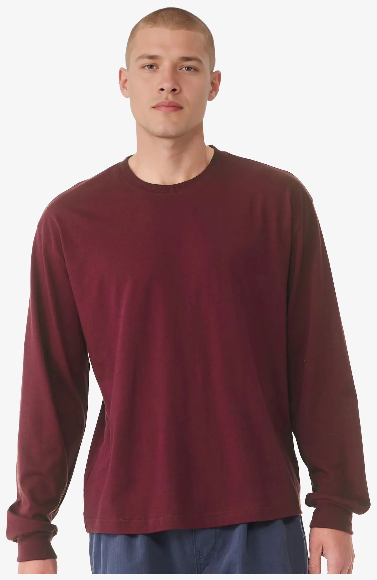 Das Langarm-tee-shirt ist ein Unisex-Langarm-tee-shirt mit Boxy-Passform, leicht überschnittenen Schultern, Seitennähten und Rippbündchen an den Ärmeln.