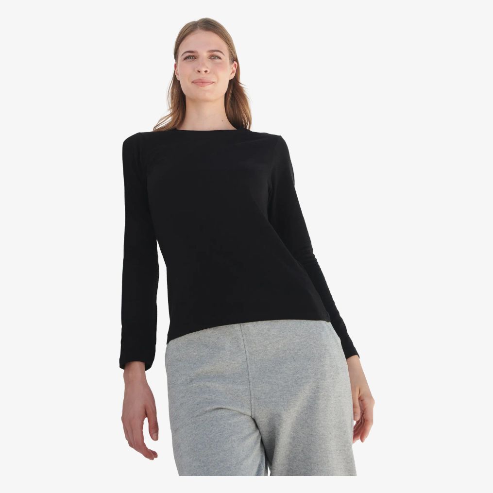 Das stretchige Langarm-tee-shirt für Damen kombiniert einen Rundhalsausschnitt mit einem langen Schnitt. Das Etikett ist abnehmbar für mehr Komfort.