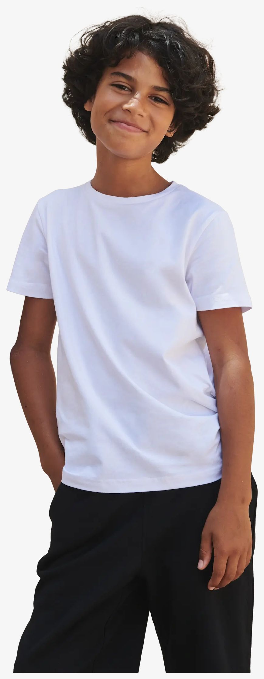 Das Kinder-Stretch-tee-shirt Kids' feel good stretch T verfügt über einen Rundhalsausschnitt, eine lange Passform und ein abtrennbares Etikett. Das Material wurde für ein weiches Hautgefühl behandelt.