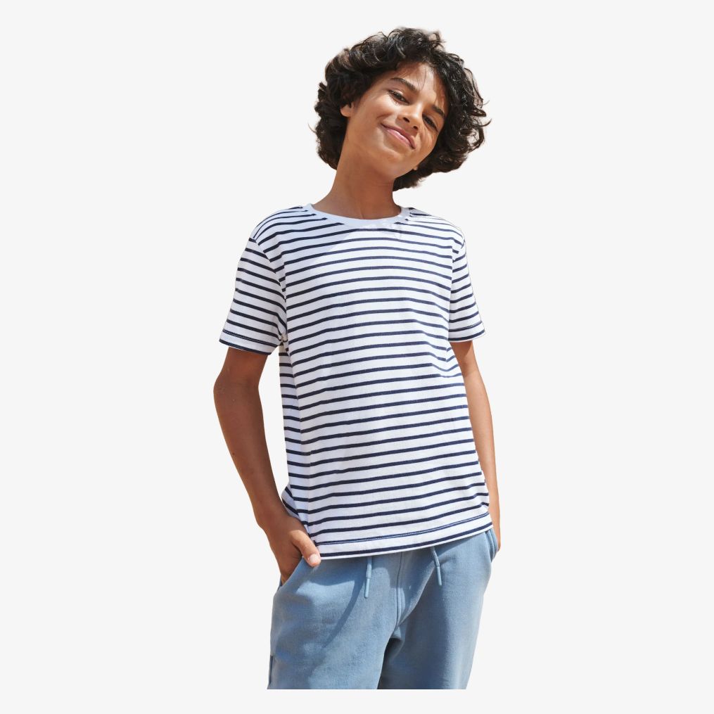 Das tee-shirt Kids' striped T ist ein unisex Kinderstreifentee-shirt mit klassischem Schnitt und abnehmbarer Etikette. Es besteht aus 100% Baumwolle.