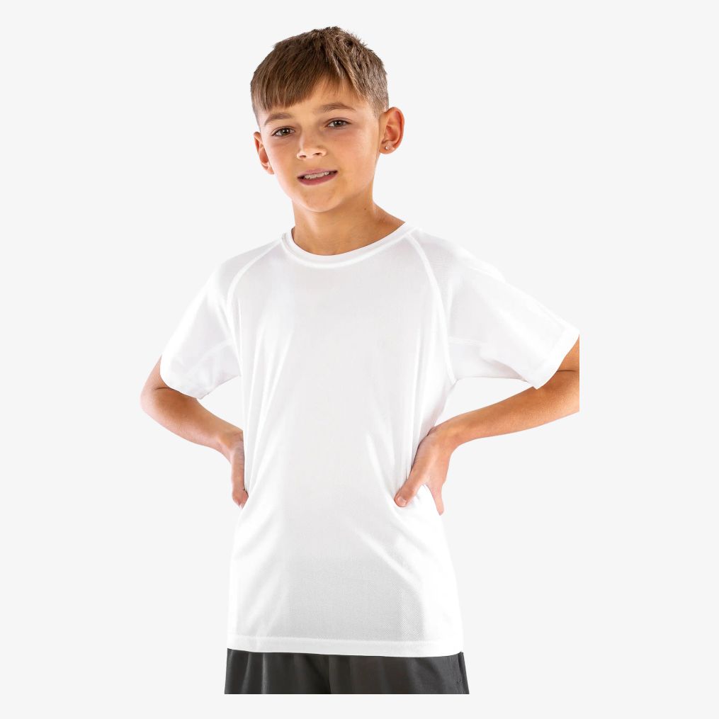 Das Performance Aircool tee ist ein Kinder-tee-shirt aus Netzstrick mit Stretch und lockerer Passform, geeignet für Alltagsaktivitäten. Das lufttrocknende Material und die etikettlose Verarbeitung erleichtern das Tragen. Nähte im oberen Schulterbereich und Detail an den Ärmeln.