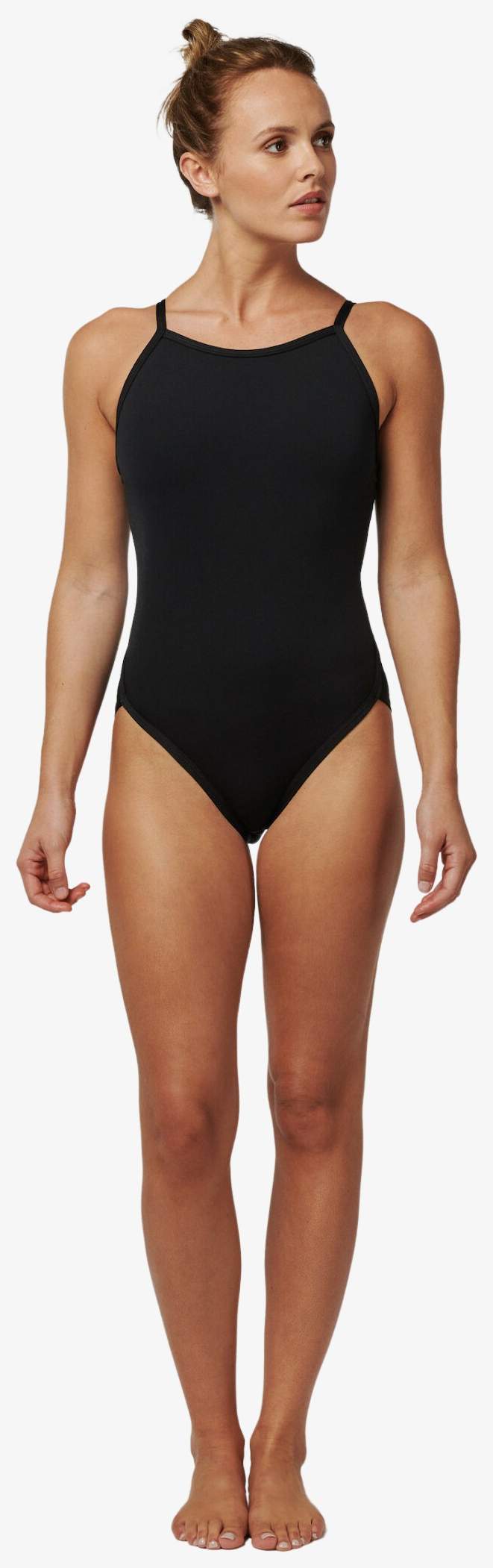 The women's one-piece swimsuit is made of highly stretchable fabric with UV 50+ protection. It is front lined to prevent transparency and has a shallow neckline with a racerback. The high leg cut slims the figure.