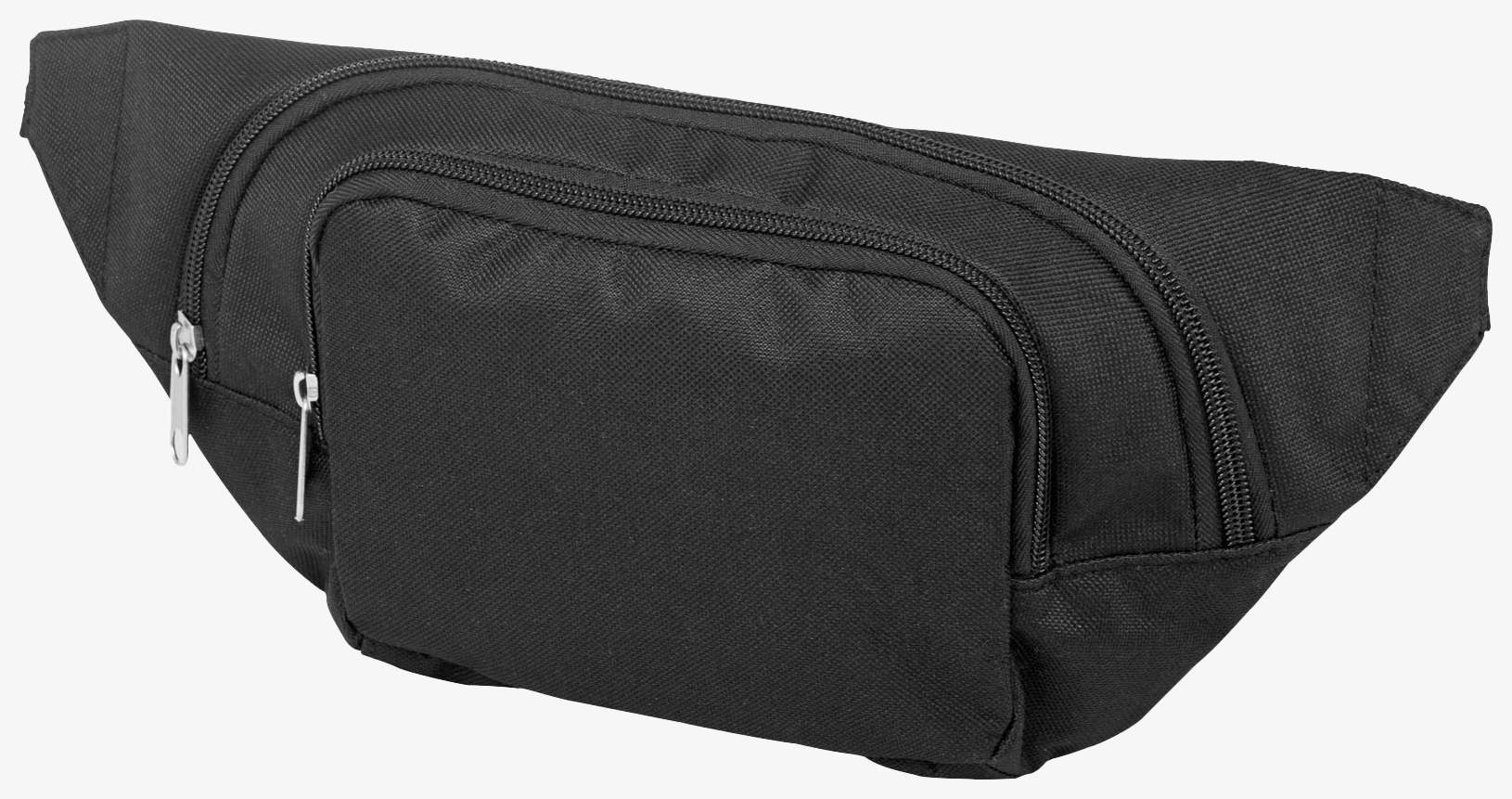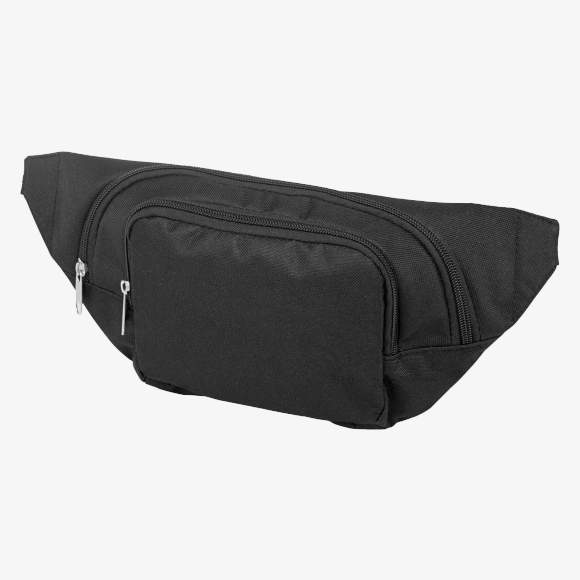 The waist belt features two large zippered compartments and an adjustable belt with quick-release buckle. It measures 36.5 x 5.5 x 14 cm.