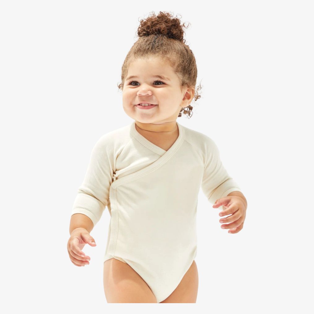 The Baby Kimono Bodysuit is a long-sleeve kimono bodysuit with raglan sleeves and snap buttons at the leg opening, to simplify dressing and diaper changes.