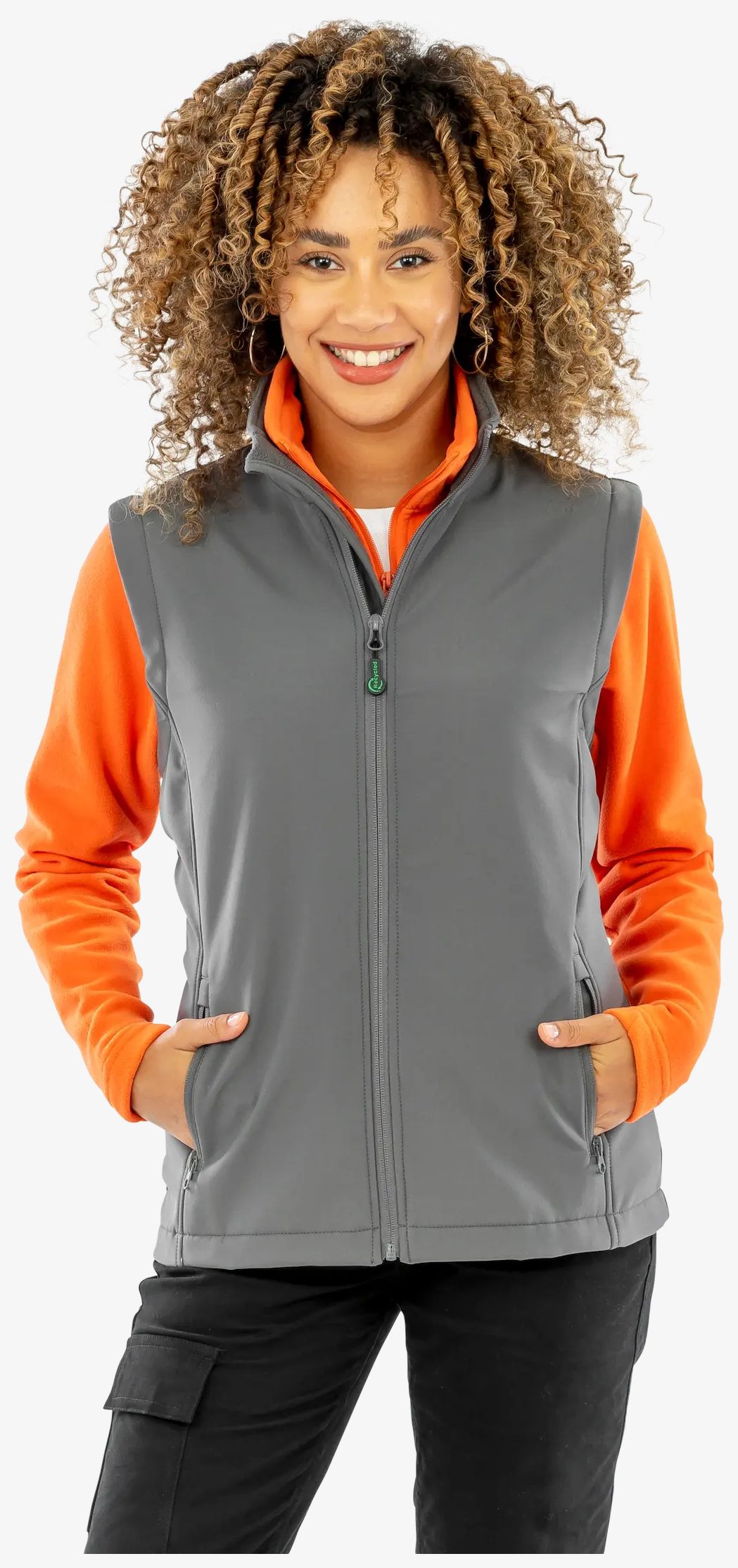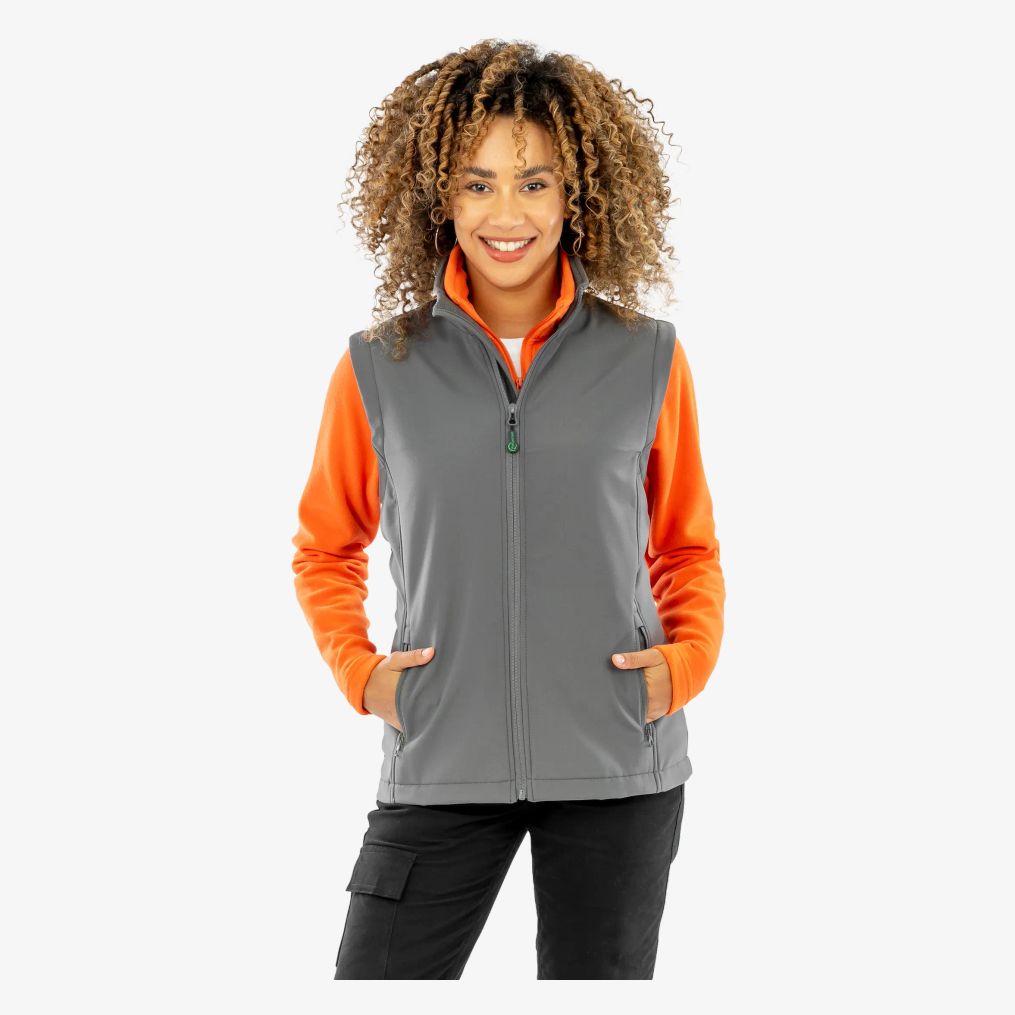 The Recycled Softshell Bodywarmer is a women\"s recycled softshell bodywarmer, lightweight, soft-touch, breathable, windproof and water-resistant. Stand-up collar with chin guard, fitted waist and zipped pockets.