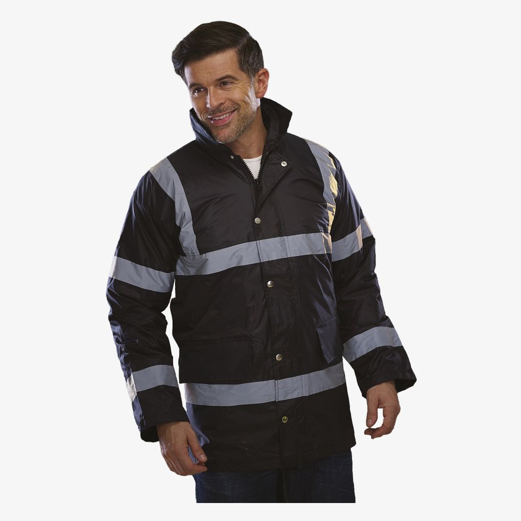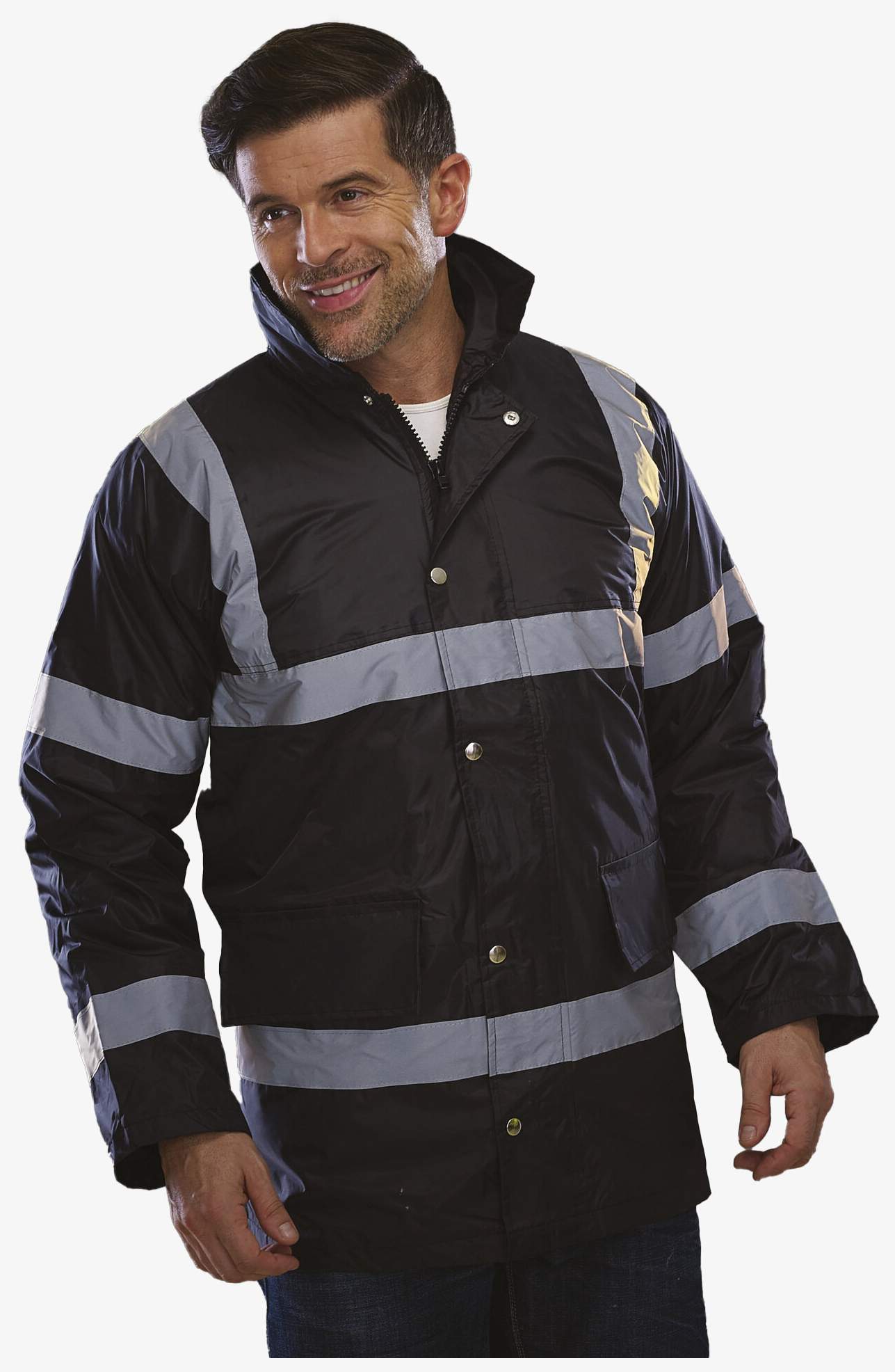 The Veste sécurité is a waterproof and windproof jacket with an integrated hood in the collar, zip with snap-button storm flap, 2 outer pockets and an inner chest pocket. 420D nylon outer with PU coating, nylon lining, quilted padding.