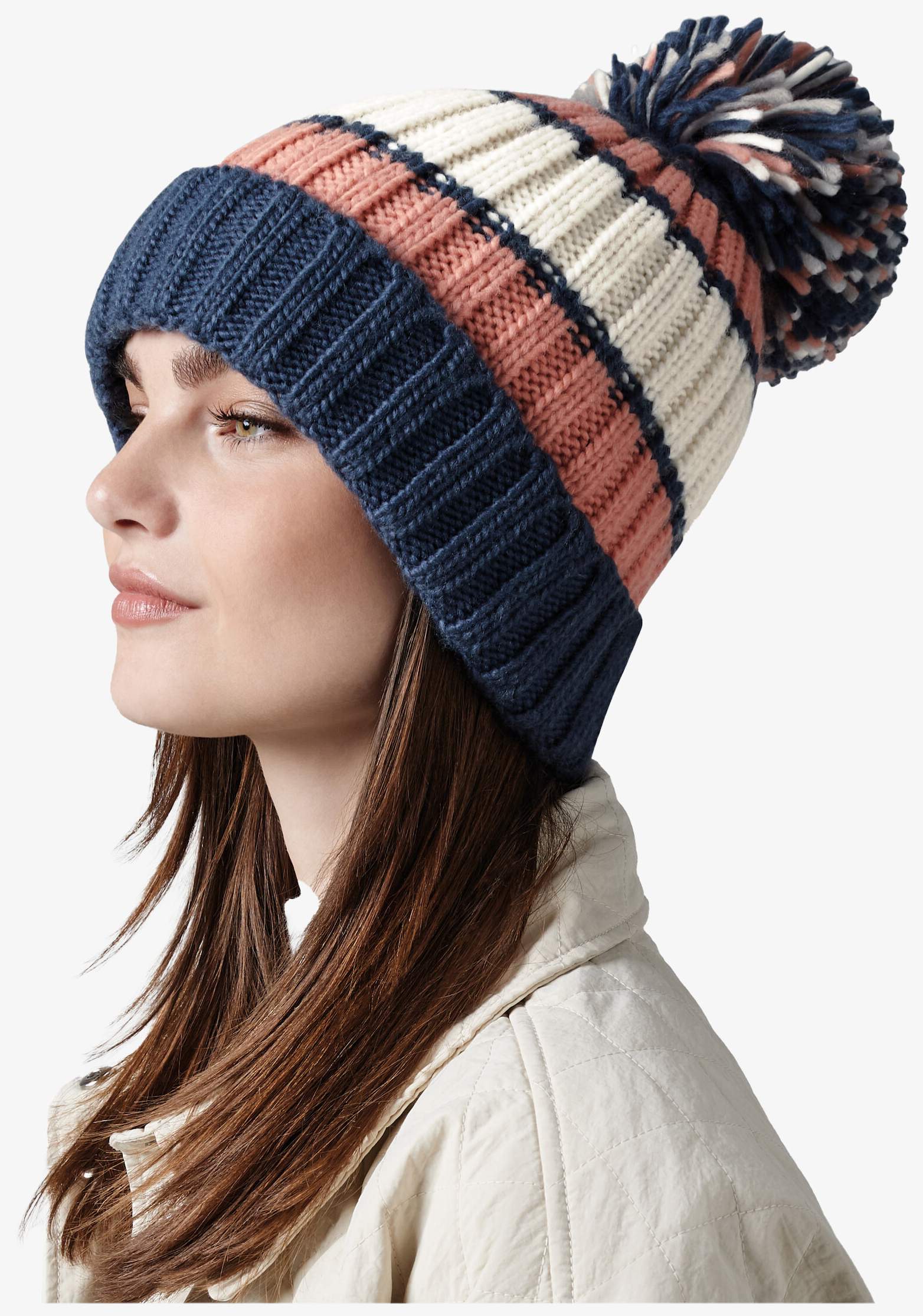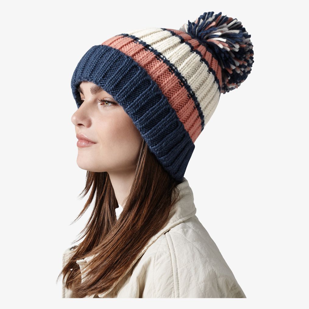 The thick ribbed knit hat features tricolor stripes and an oversized pompom. The faux sheepskin lining adds an extra layer of warmth. It is designed with a cuff and a detachable label.