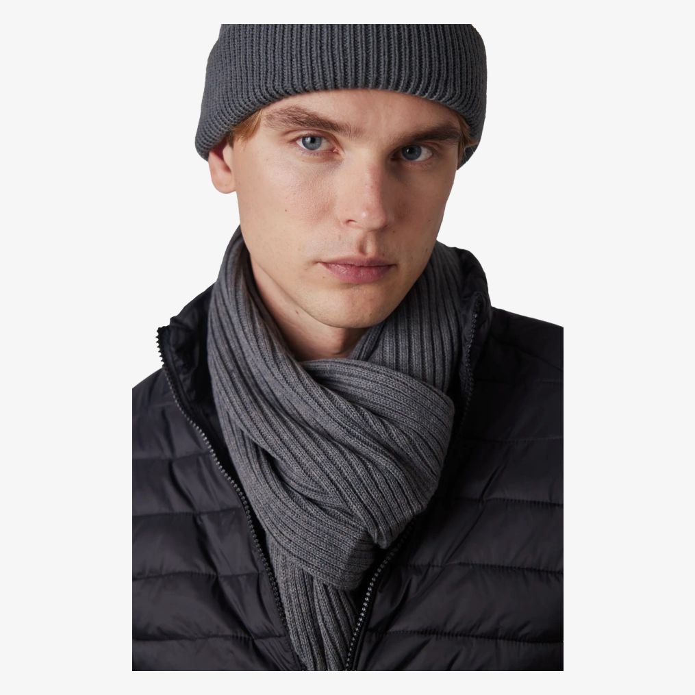 The rib knit scarf combines softness and comfort thanks to a synthetic fiber designed to limit its environmental impact. It uses a Polylana® yarn, an alternative to acrylic with production requiring less energy and water.