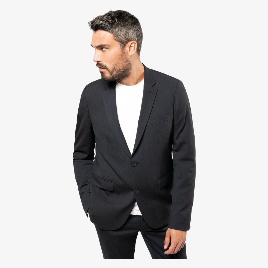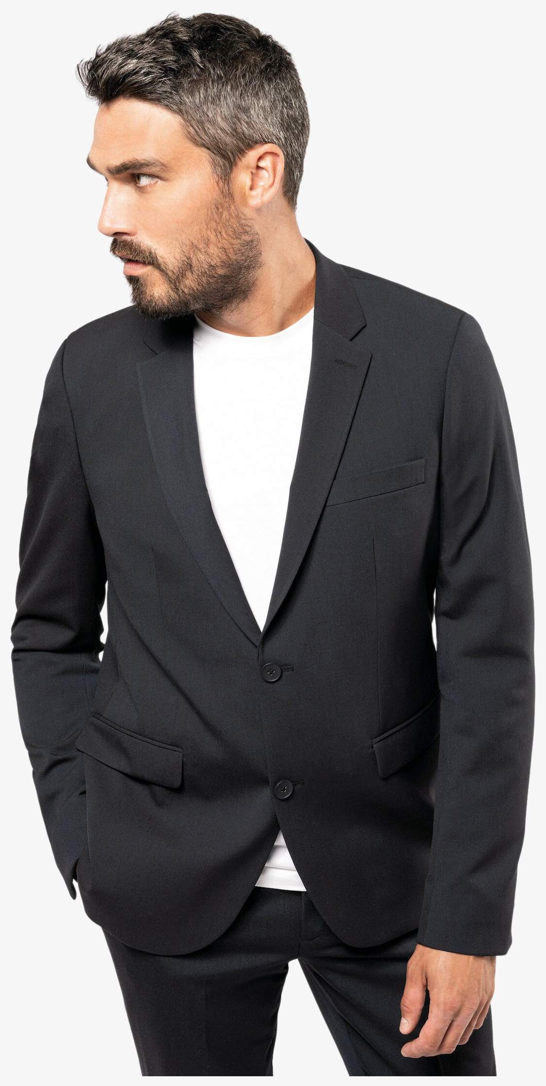 The men's jacket in polyester, viscose and elastane features a polyester taffeta lining. It includes two buttons, two welt pockets with flap on the front, a chest pocket, and two buttoned internal pockets including one for phone. The sleeve cuffs have four buttons and the back includes two vents. An invisible zip on the heart side allows additional access.