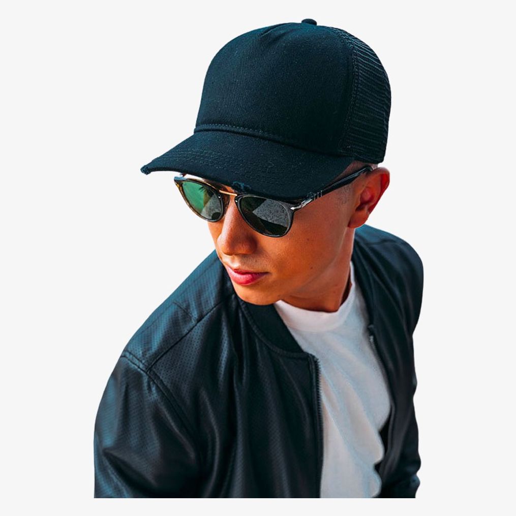 The 5-panel cap features a cotton front panel and a polyester mesh back. The visor is pre-curved with a destroyed effect. The cap includes four seams on the visor and a cotton sweatband.