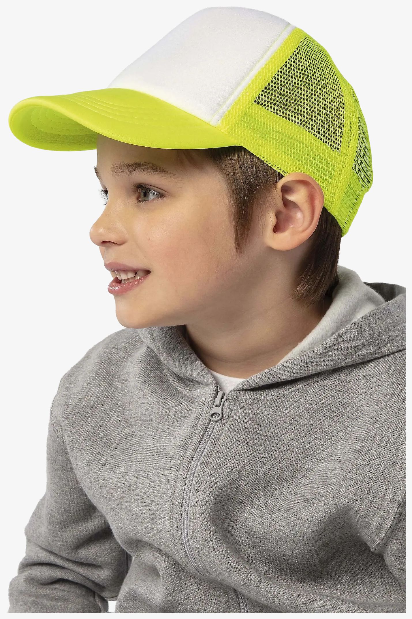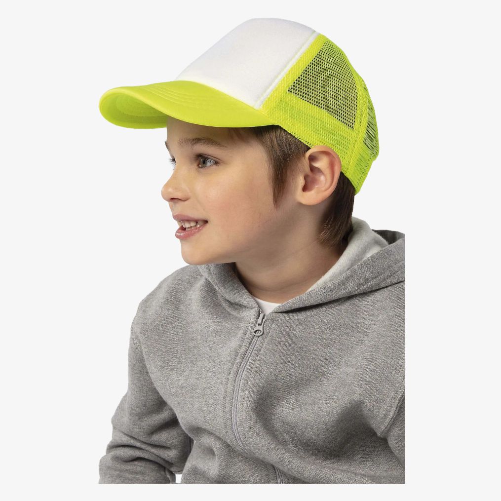 The children's cap Bubble Kids is designed with a 5-panel shape and a plastic adjustment strap. The front panel is foam while the back panels are mesh.