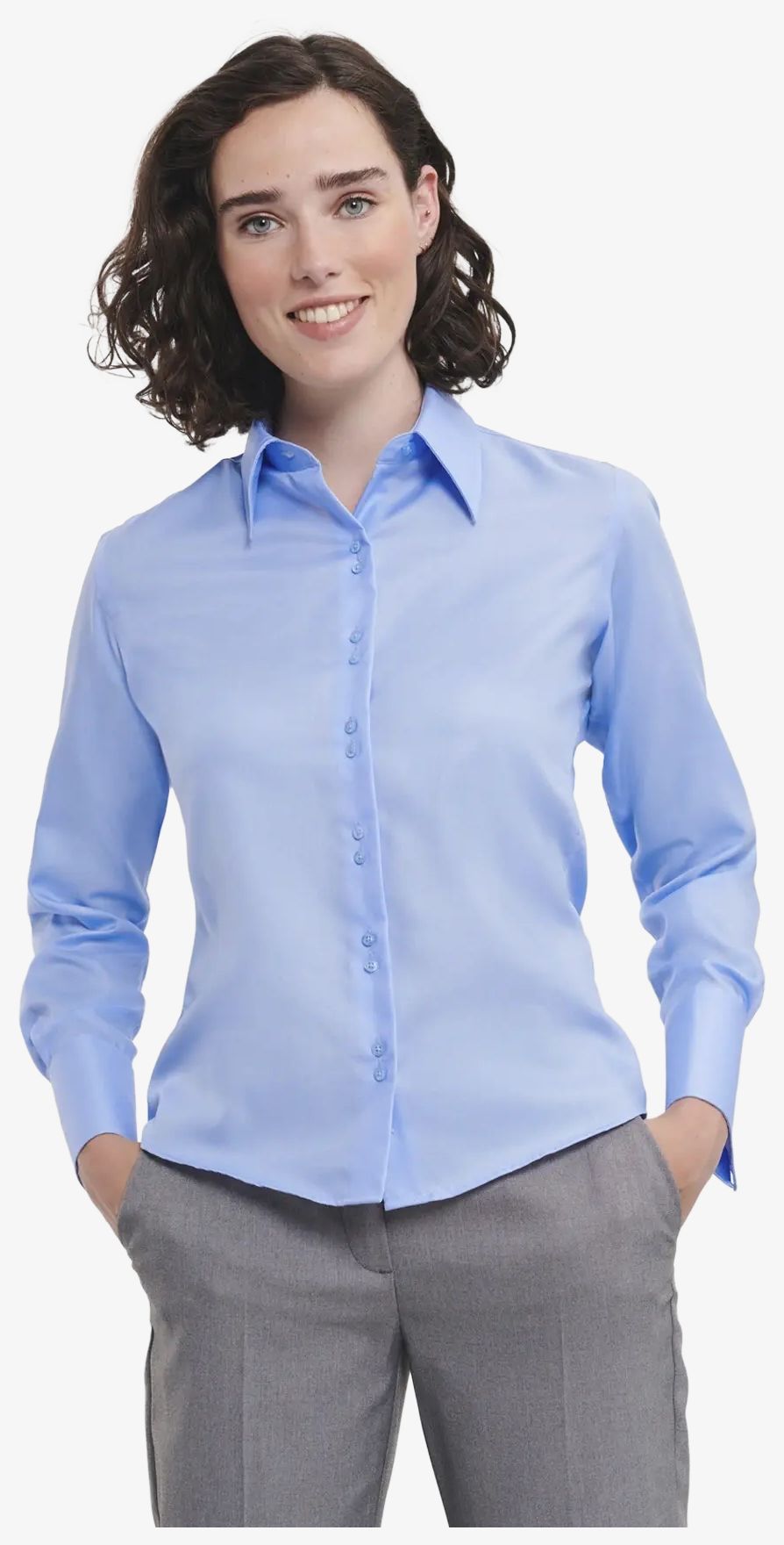 The Ultimate non-iron slim fit long sleeve shirt women is made of micro twill cotton. It features a slim fit with a rounded hem and a long comfortable collar. The double buttoning and matching buttons ensure closure. The cuffs are flared and closed with a single button.
