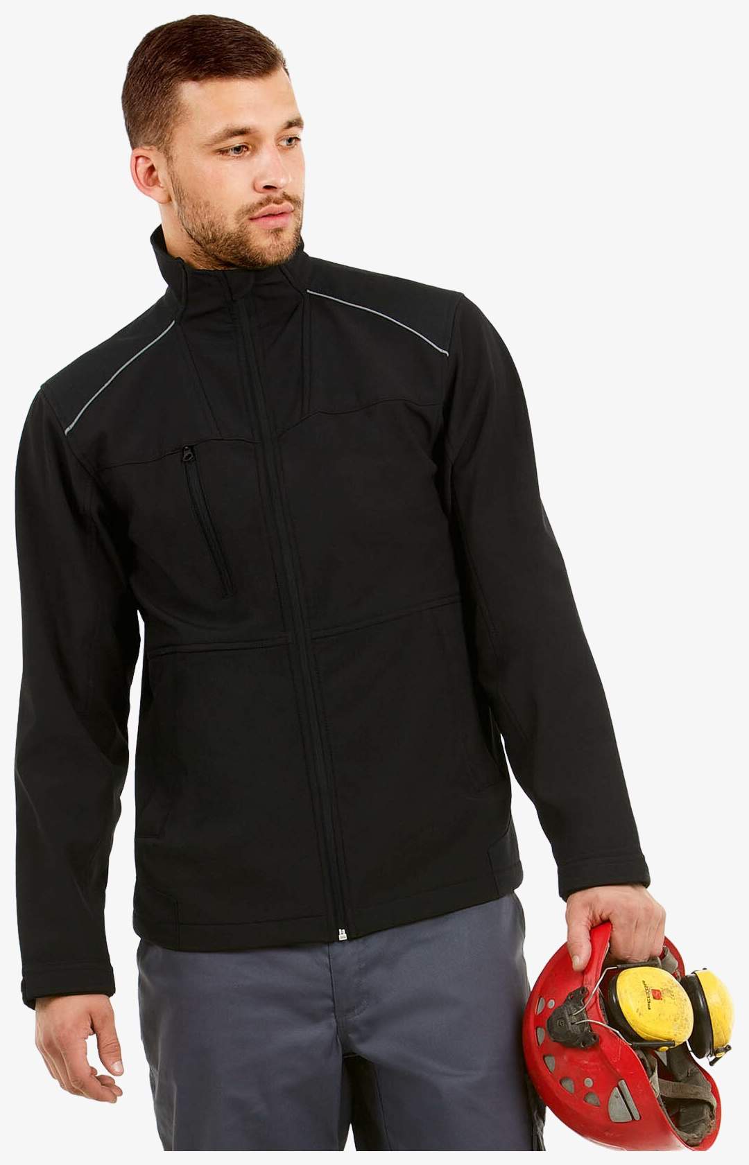 The PRO 3-layer softshell jacket is designed with a microfleece inner lining for enhanced warmth. It includes reinforcement pieces on shoulders, elbows and lower back edge. The longer back facilitates movement and protection when kneeling or bending. Reflective piping is present on shoulders and lower back to increase visibility. Seamless shoulders improve comfort and water resistance. The ergonomic design and fabric elasticity optimize freedom of movement. Five spacious pockets are distributed outside and inside. Full access is provided for decoration on front, back and sleeves. The hem is adjustable with cord stoppers.