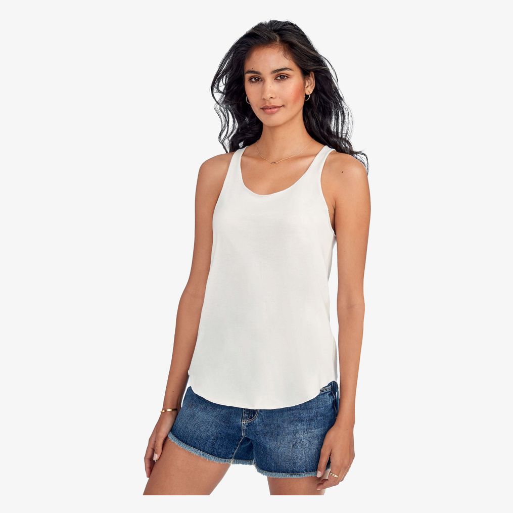 The lightweight women's tank top is made of 100% polyester with a cotton feel and sewn cut. The racerback and rounded bottom characterize its design. It is suitable for sublimation.