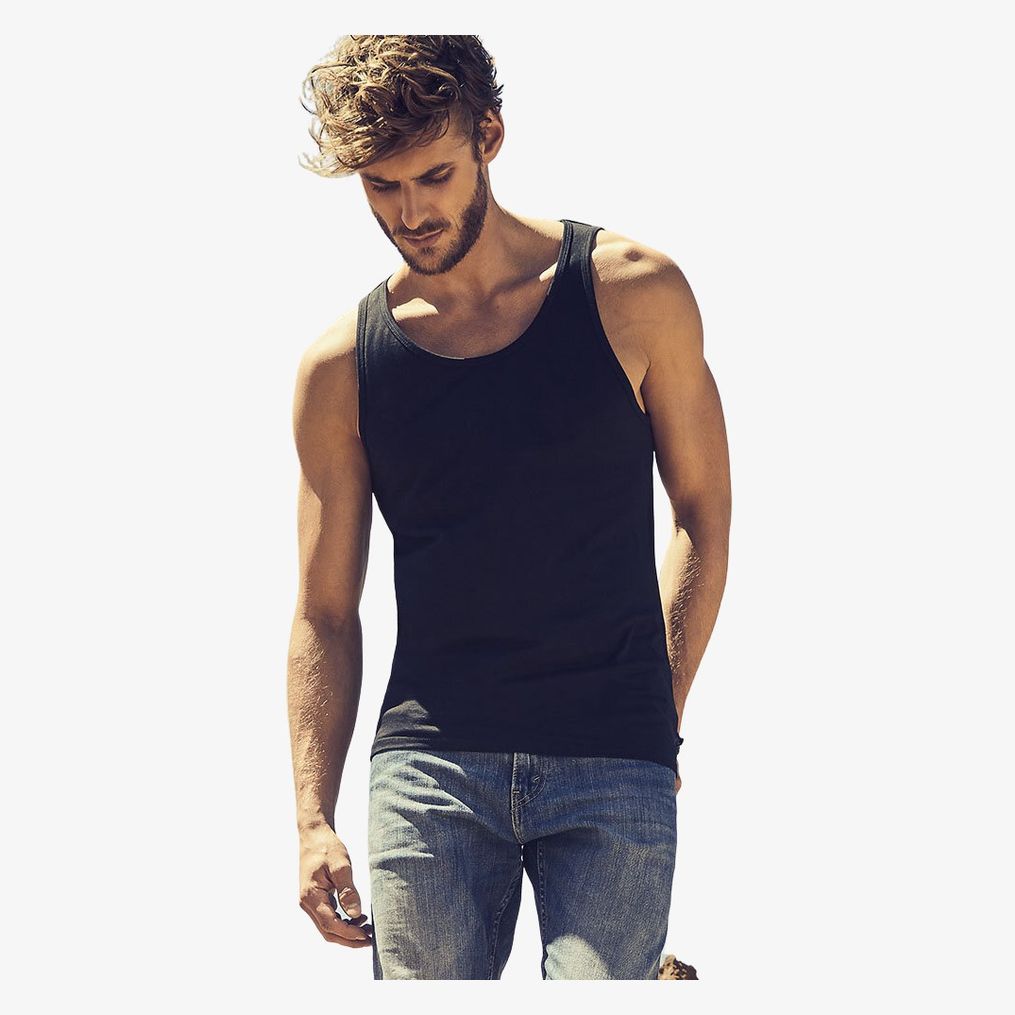 The Men's Roundneck Tanktop is a combed cotton tank top combining a soft texture and a fitted cut. It features a matching fabric neckband and a neutral size label. Reinforced shoulder seams and double side seams contribute to its durability.