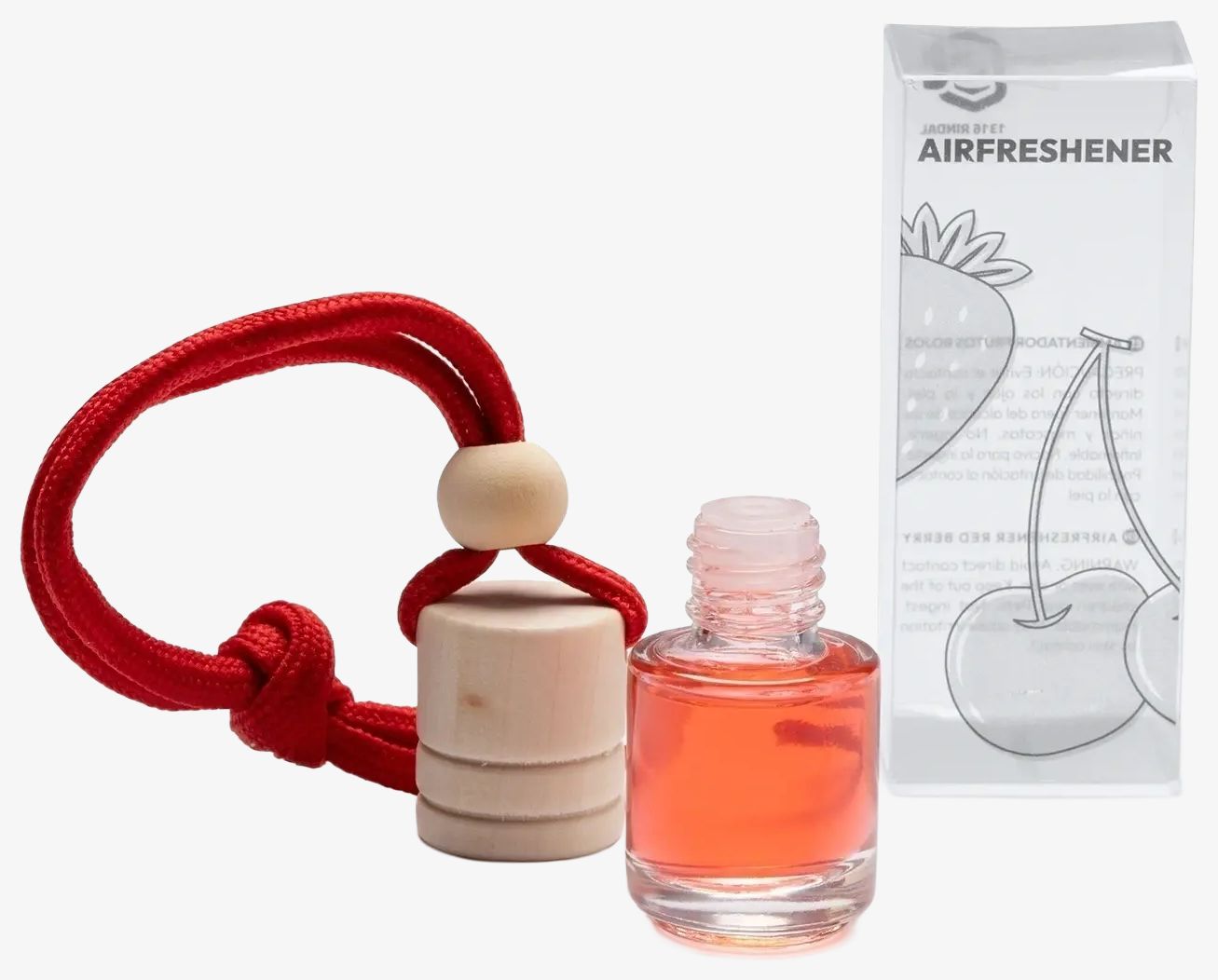 The deodorizer is in a glass container with a wooden cap and matching adjustable cord. Capacity is 5 ml. Scents vary by color: white for lavender, royal blue for ocean, fern green for pine, red for berries.