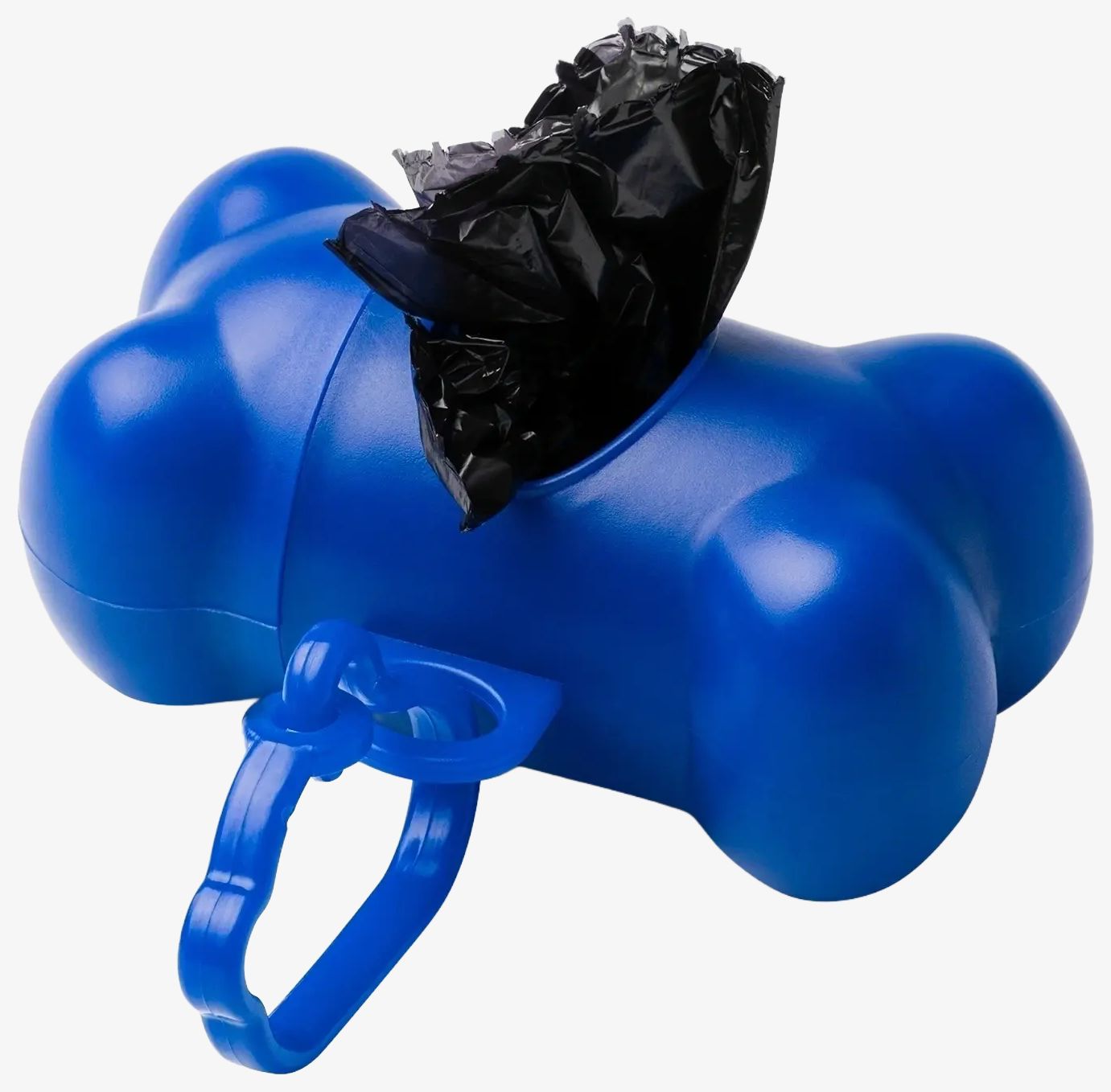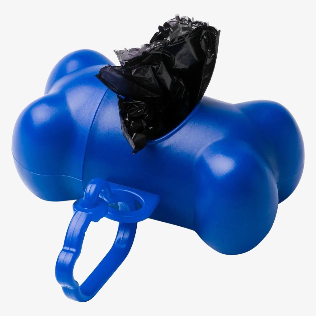 The pet bag dispenser is made of PVC and includes a matching carabiner for attachment. It contains 15 bags and is available in several colors.