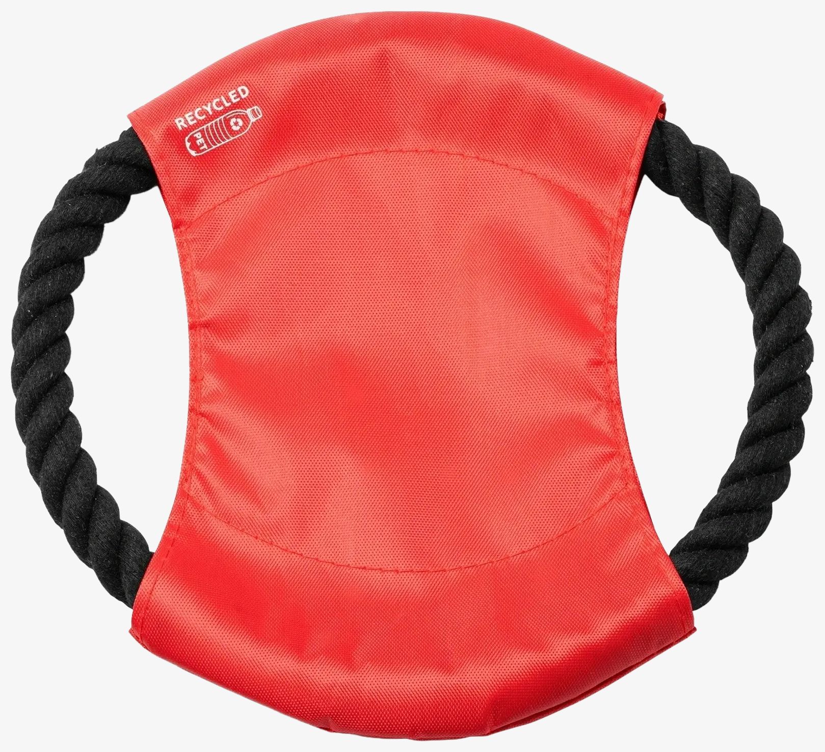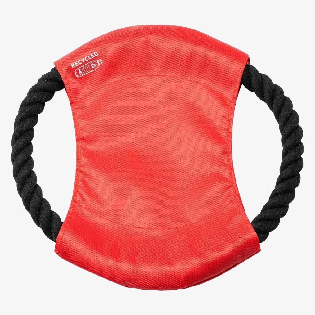 The RPET fabric frisbee is designed for pets with a central fabric in RPET and a cotton cord. This frisbee combines these materials for outdoor and indoor use.