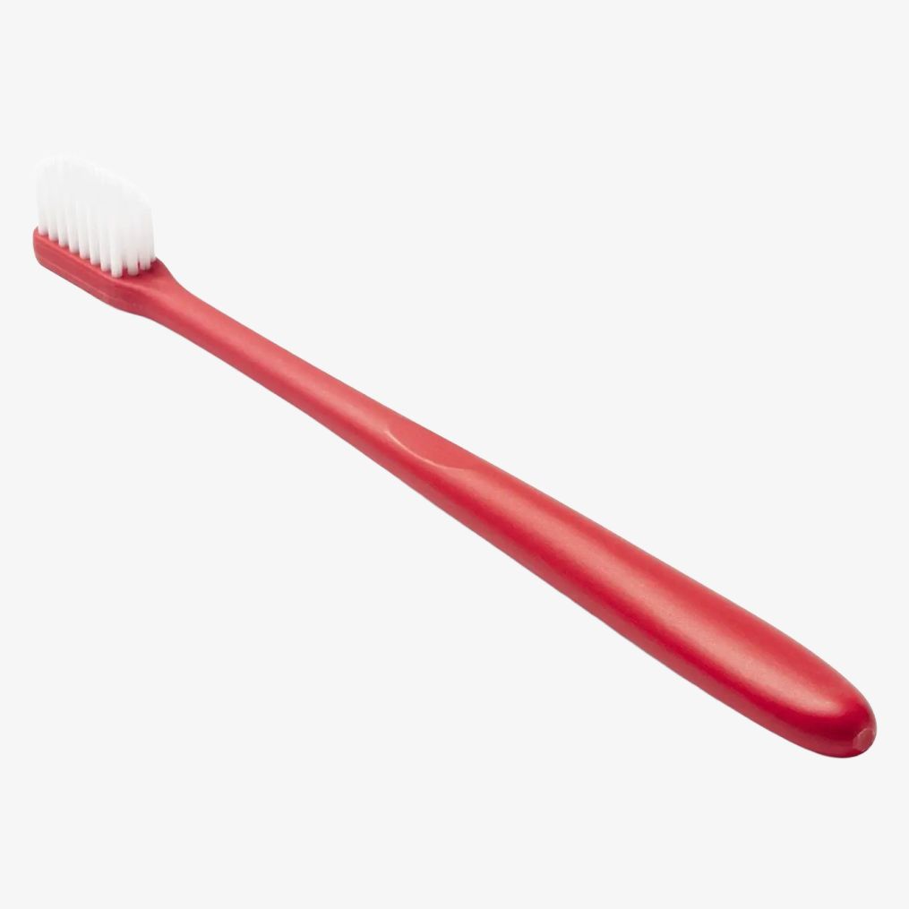 The KORA toothbrush has a PLA body and soft white bristles. It measures 18.4 x 1.6 x 1.4 cm.